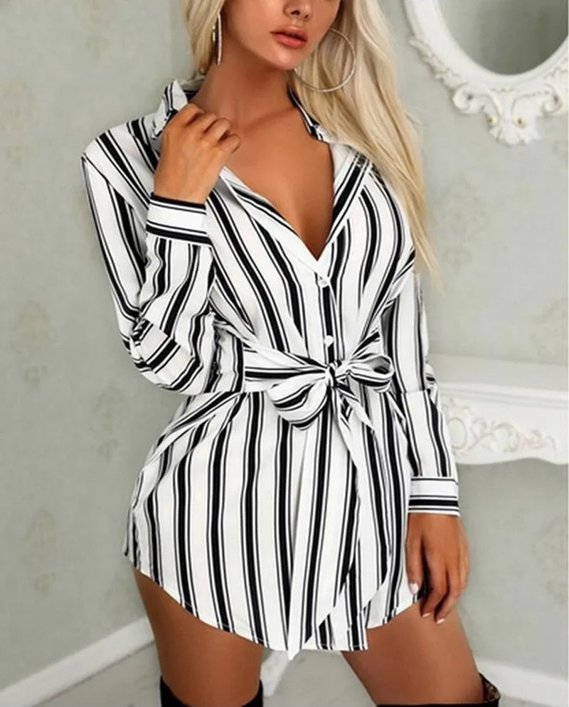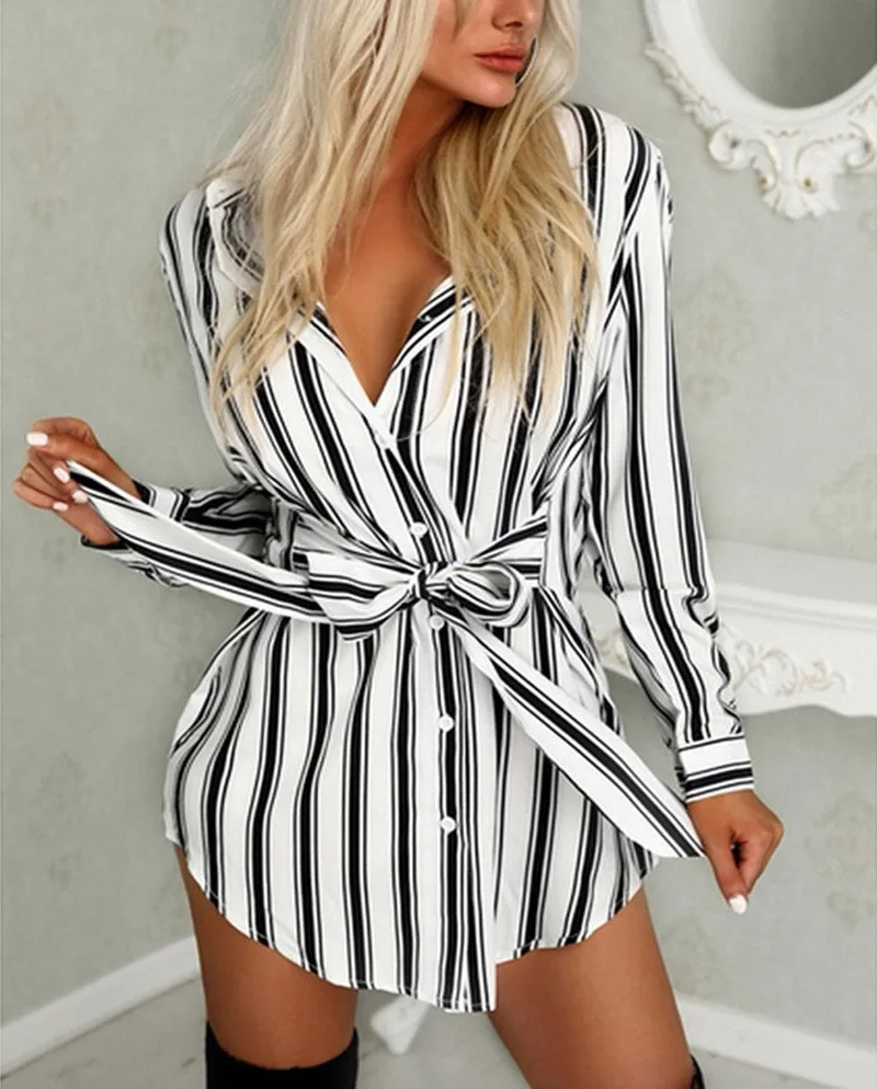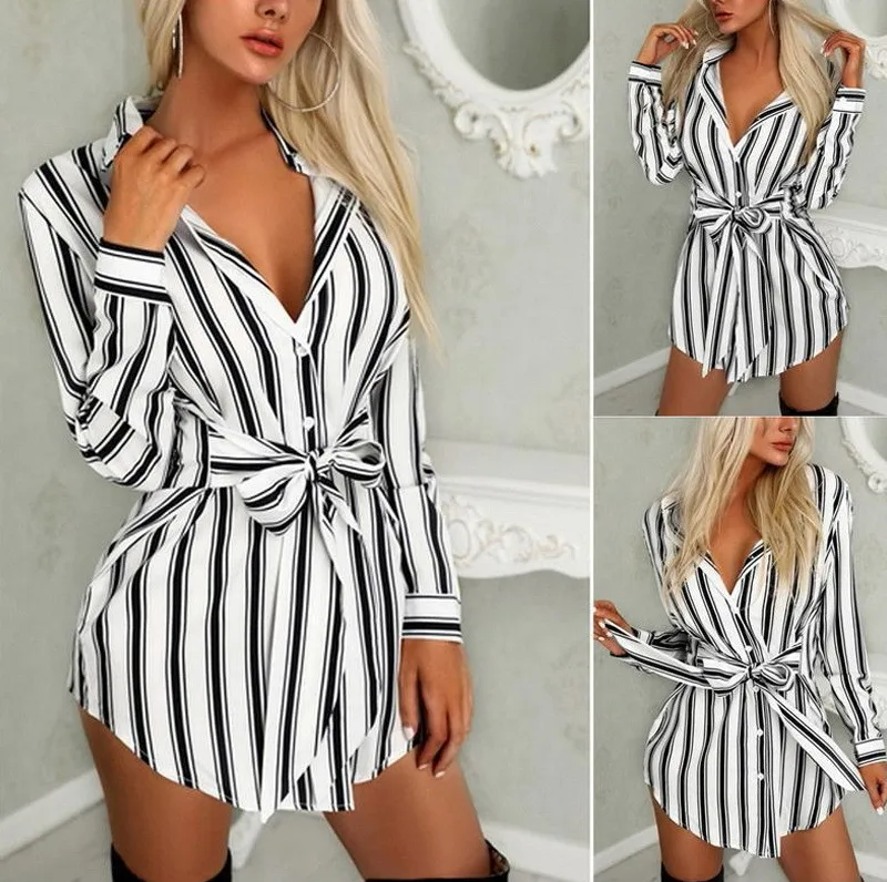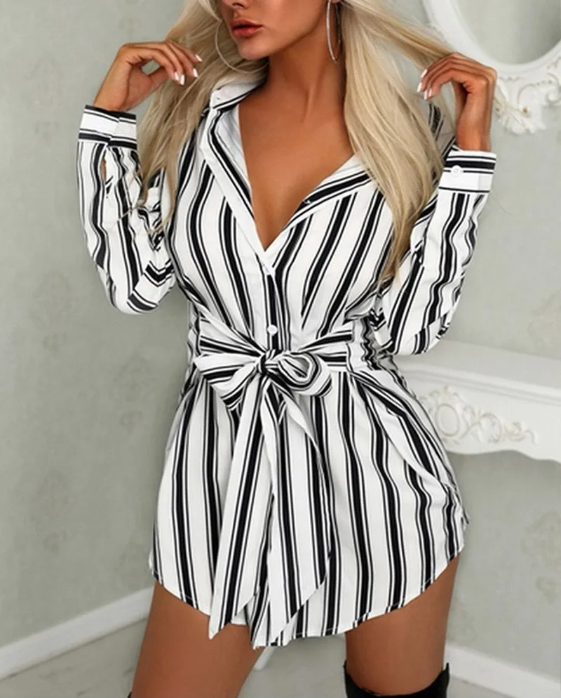 New Arrival Women Black And White Strips Shirt Collar Sashes Mini Casual Dresses