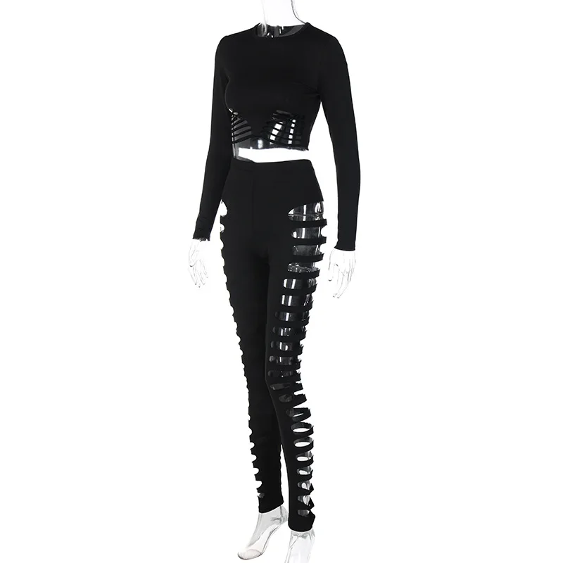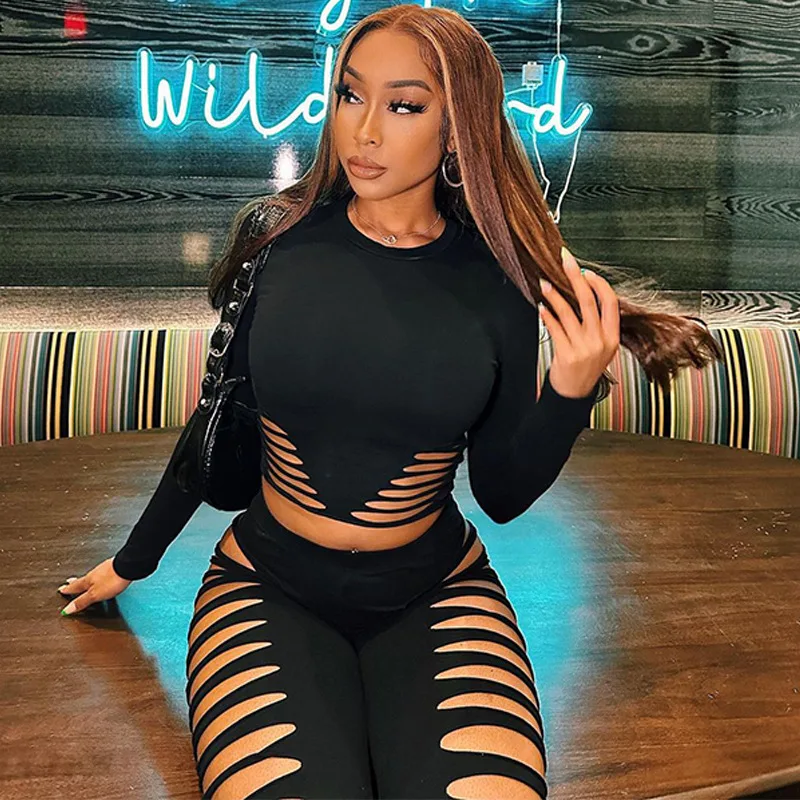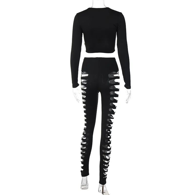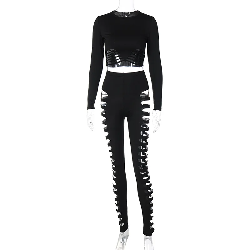 New arrival Women's Clothing Sexy Hollow Out round neck long-sleeved top Cropped Sportswear 2 Piece set Fitness sexy slim suit