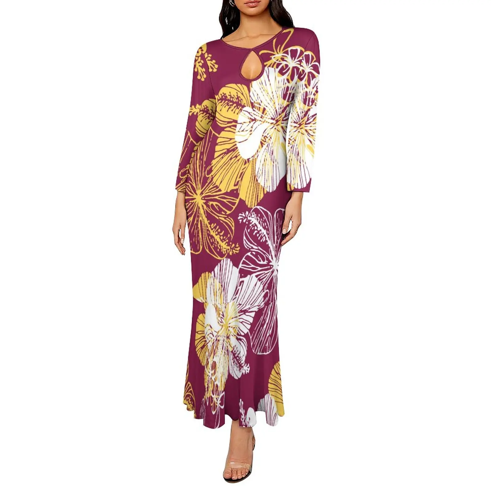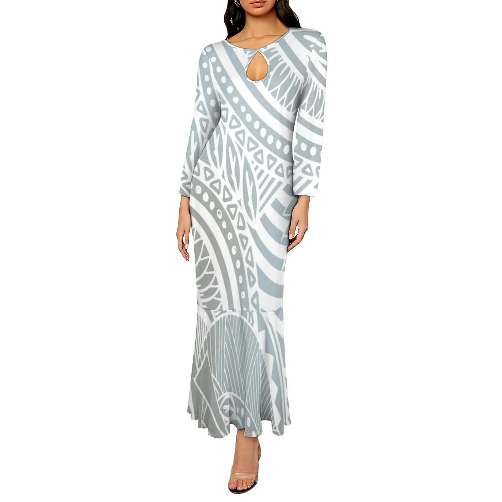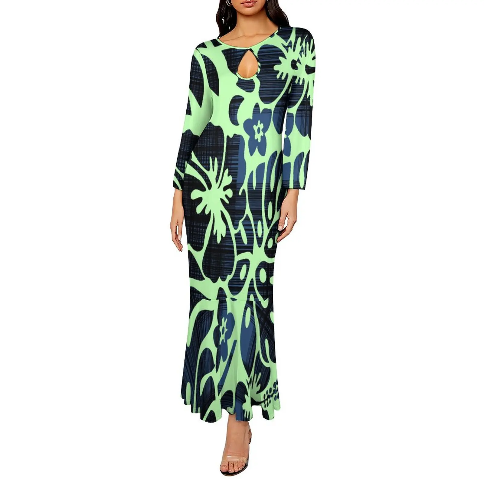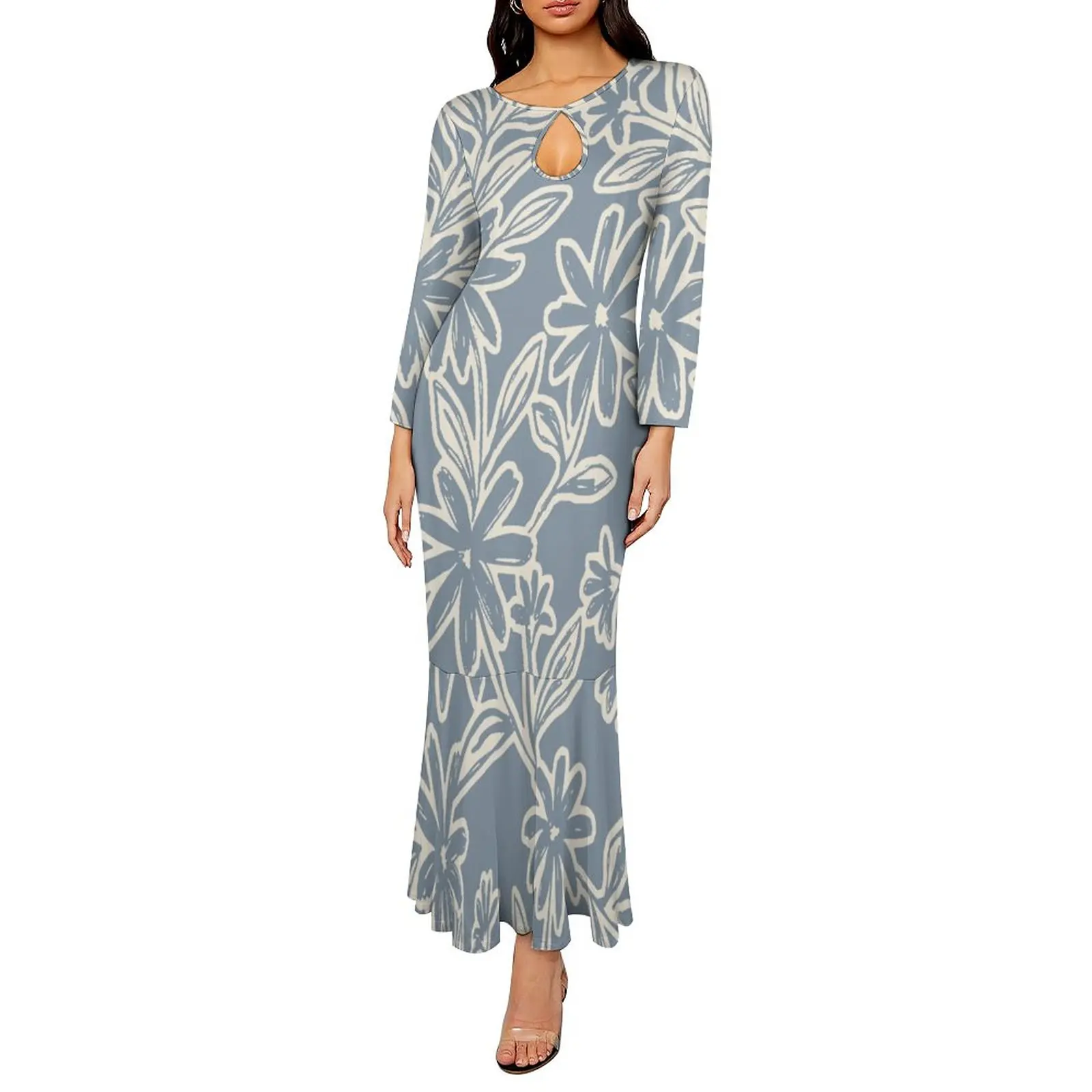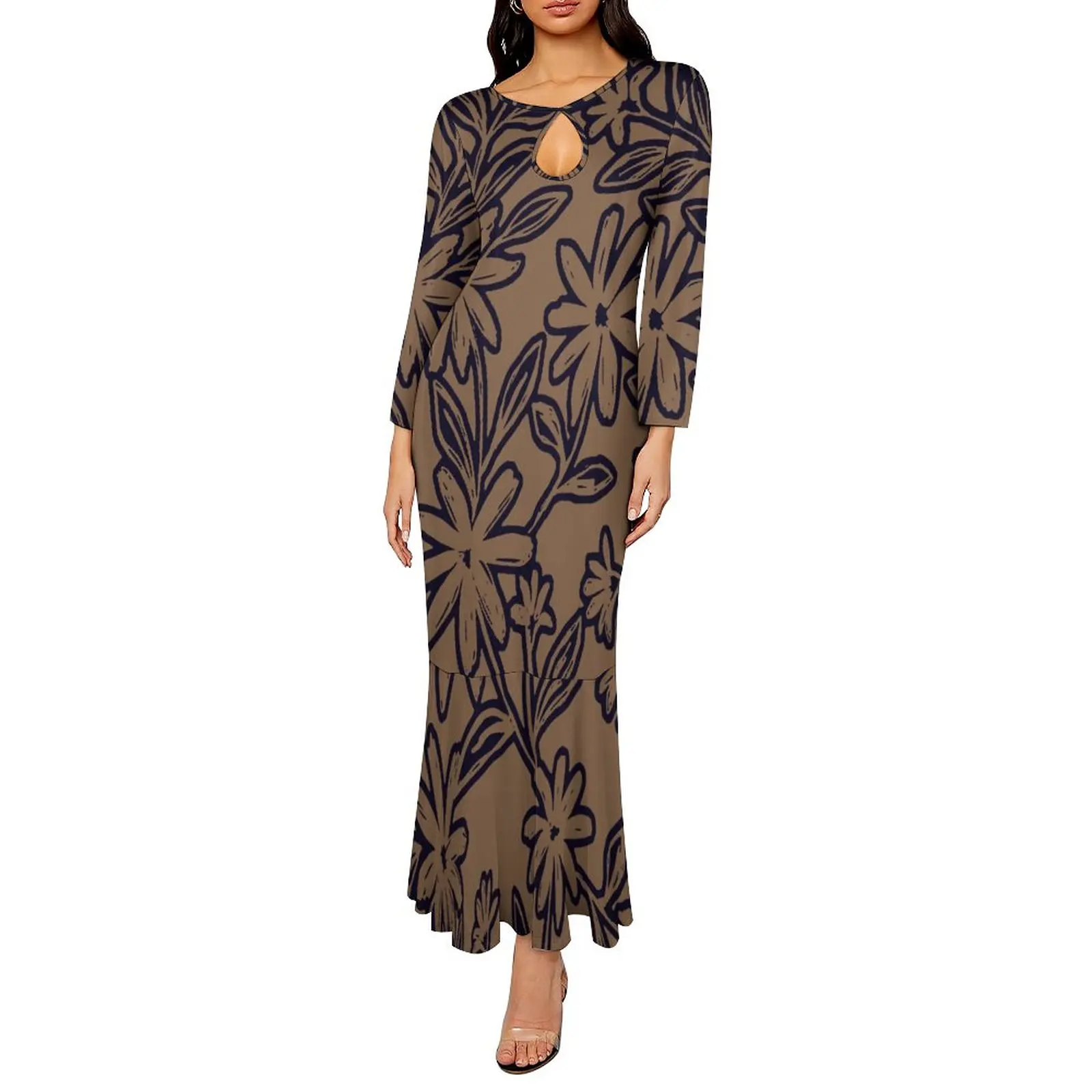 new arrivals 2023 fall new long sleeve slim fit elegant women dress polynesian hawaiian floral maxi mermaid dress