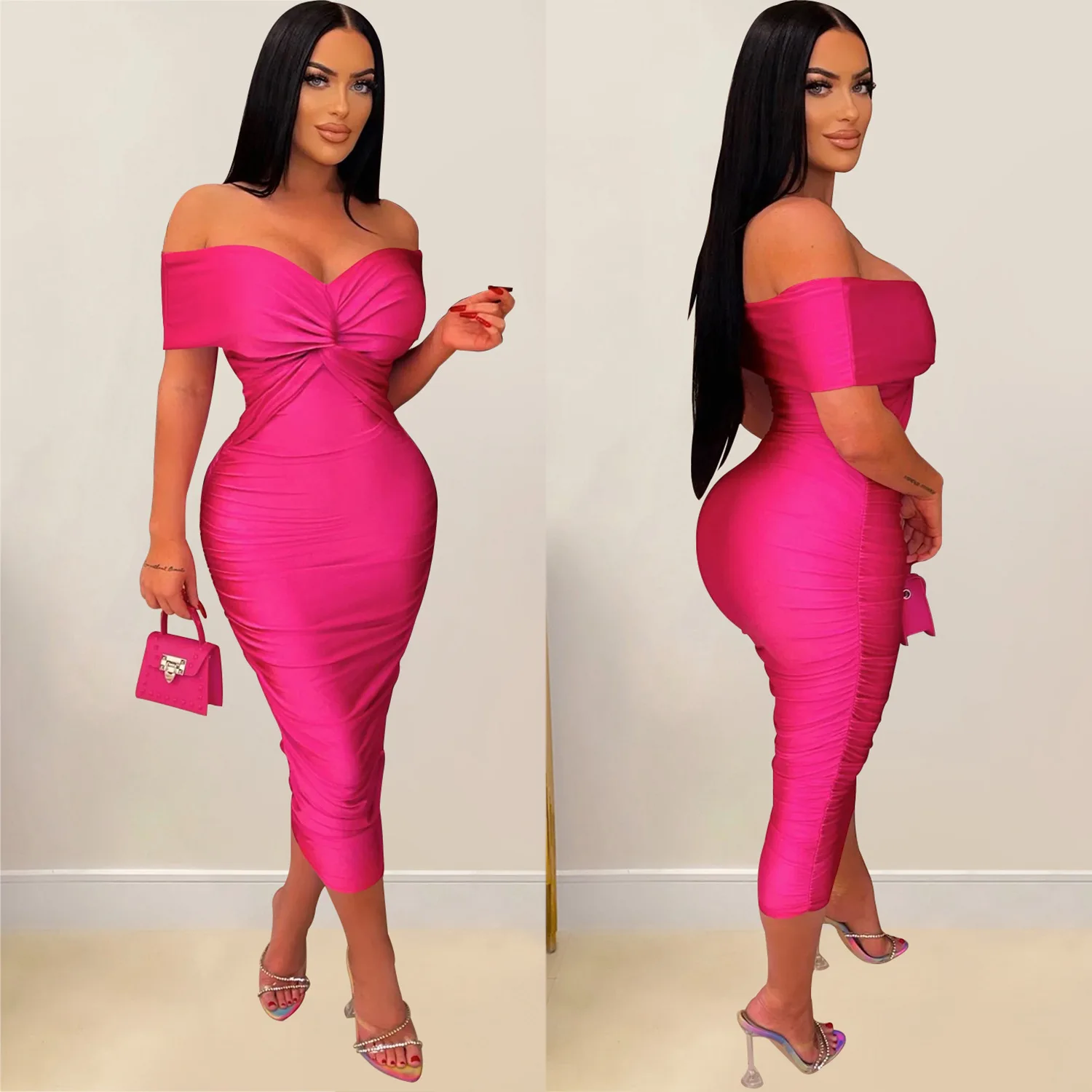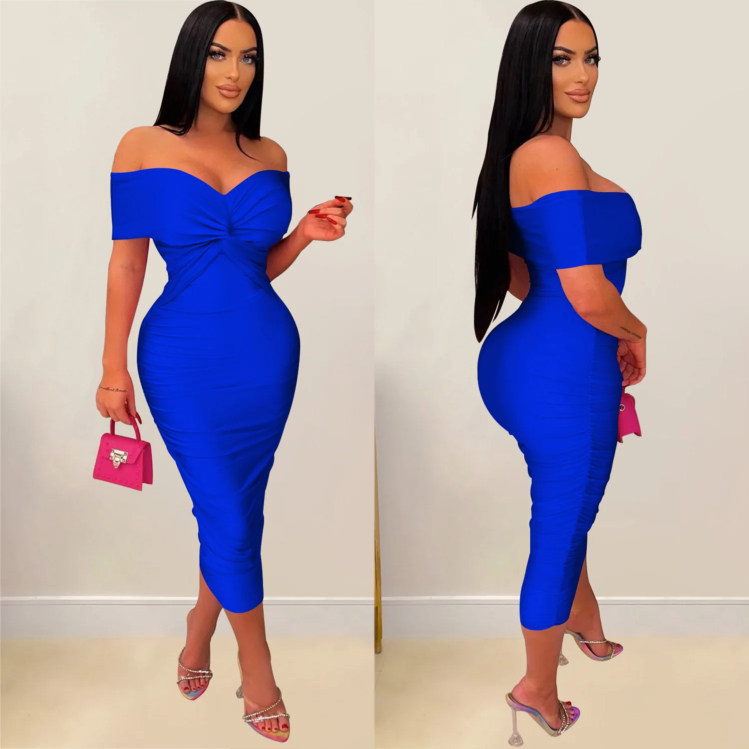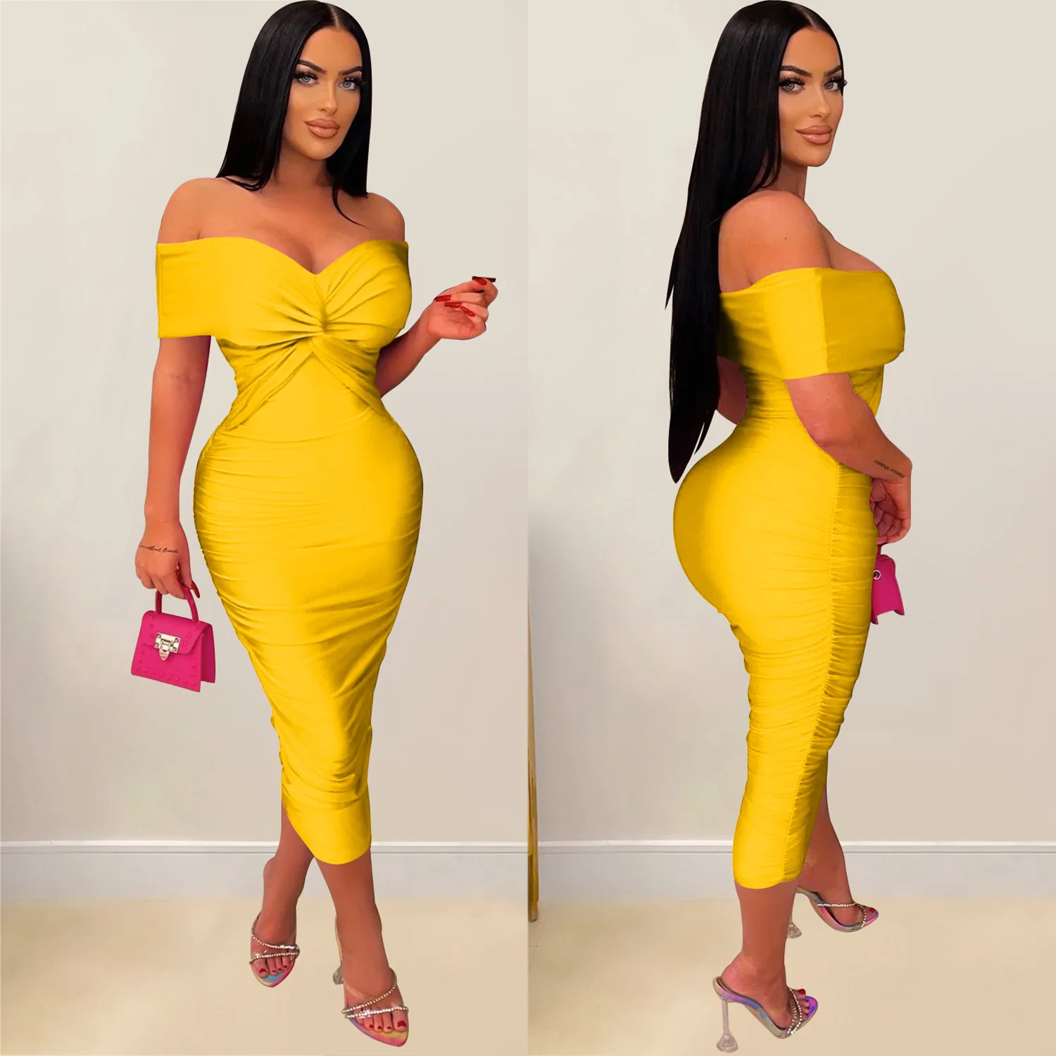 New Arrivals 2023 Sexy Solid Color Ruched Elegance Dress Off The Shoulder Bodycon Party Dress For Women