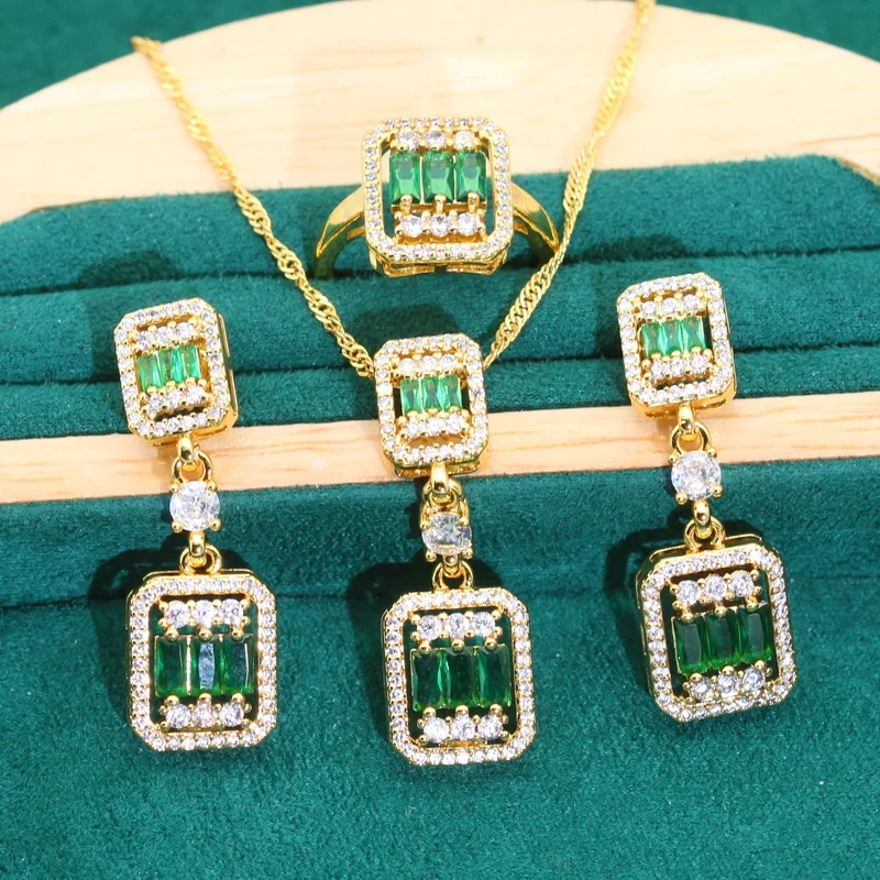 New Arrivals Gold Color Wedding Jewelry Sets for Women Green Zircon Bracelet Earrings Necklace Pendant Ring Halloween Gift