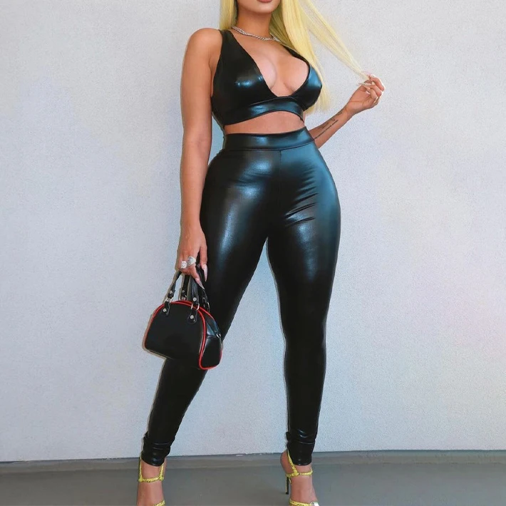 PU faux leather women sexy deep V neck crop top and pants leggings club outfit 2 piece