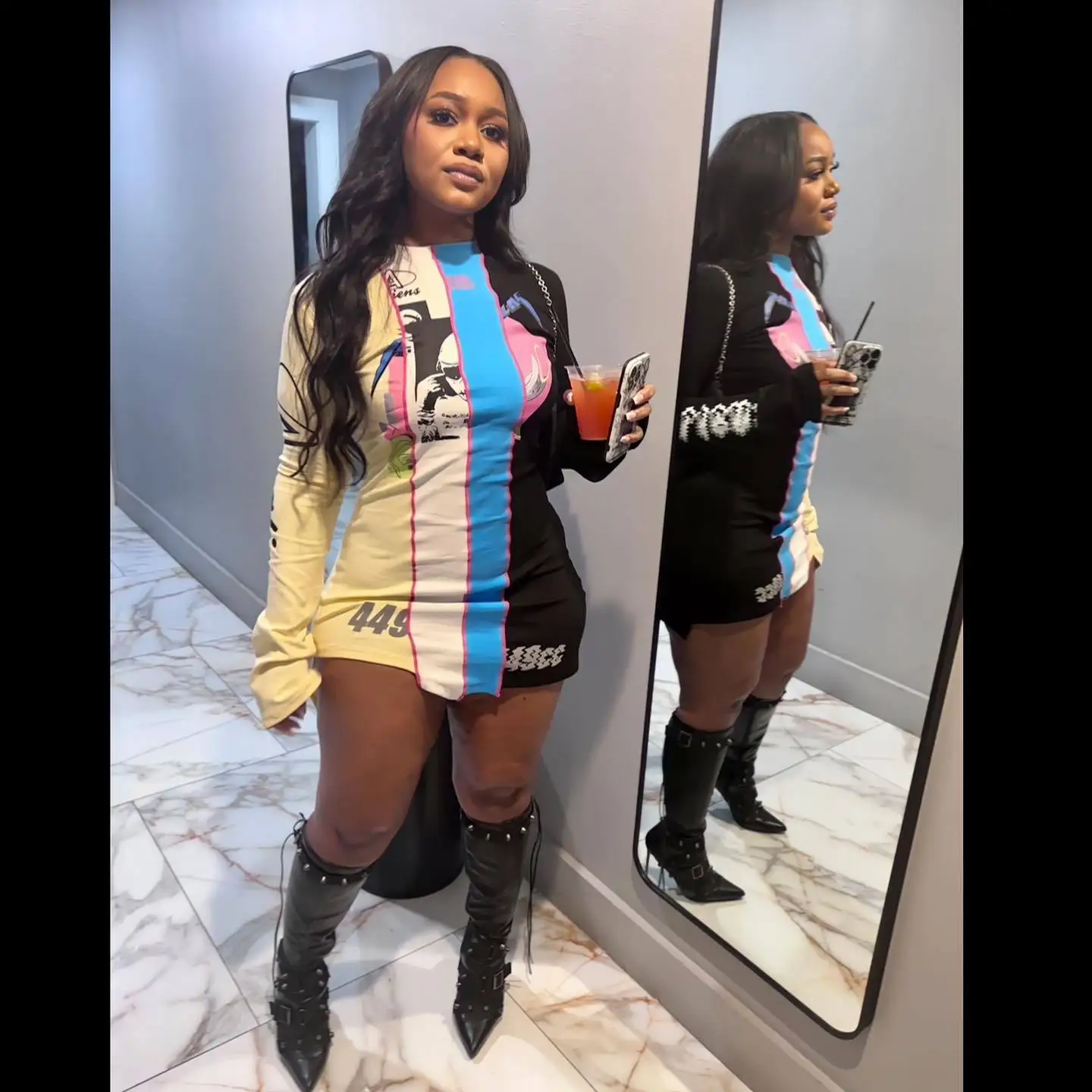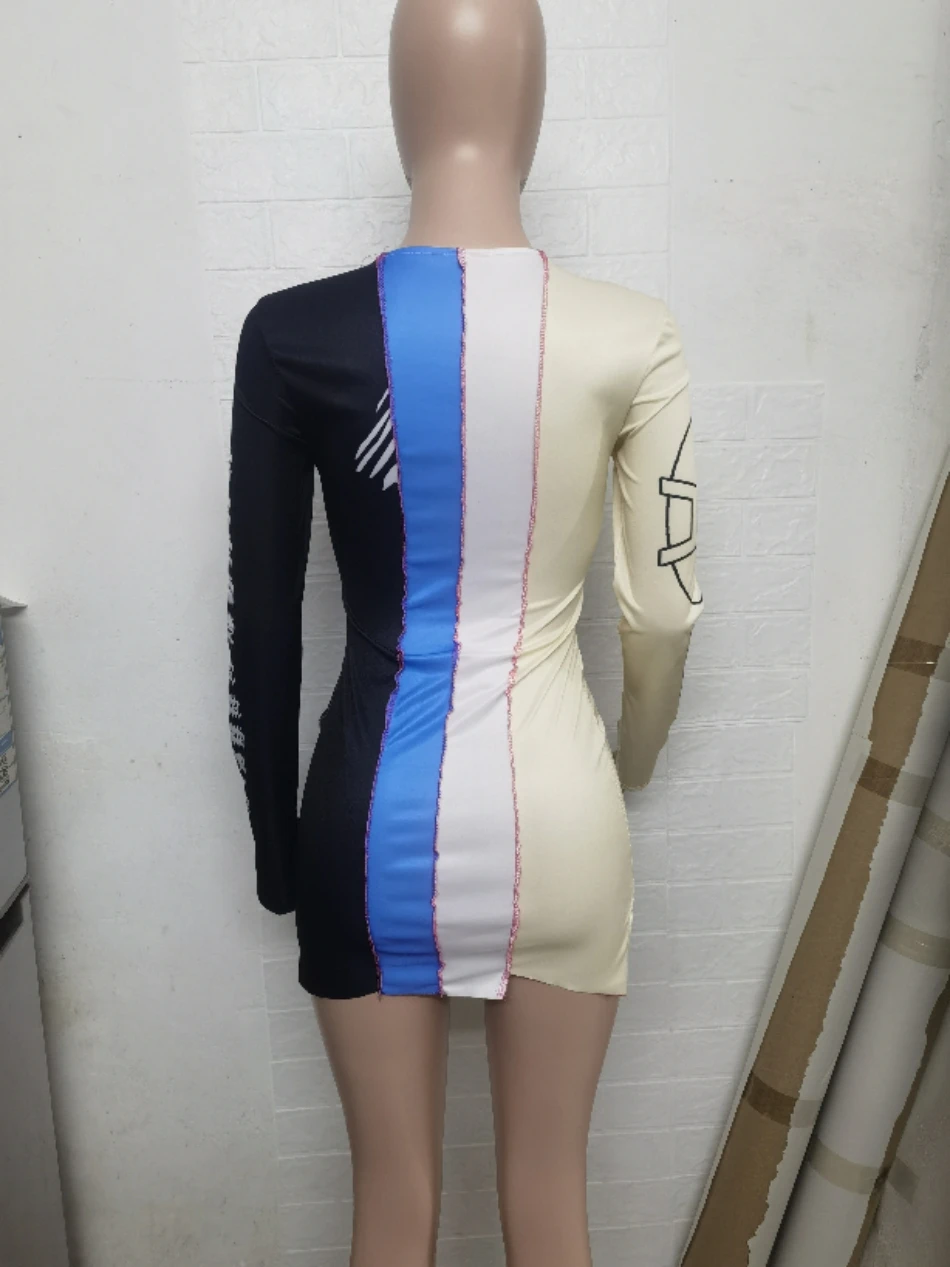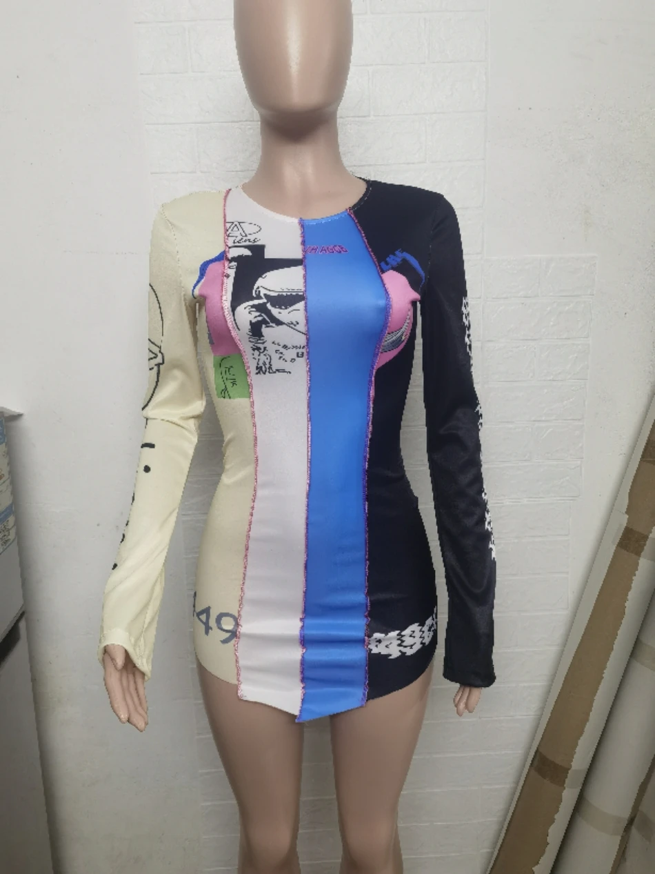 New Arrivals Spring 2023 Women Dresses Trend Patchwork Women Print Long Sleeve Black Dress Sexy Fitted Mini Bodycon Dress Women