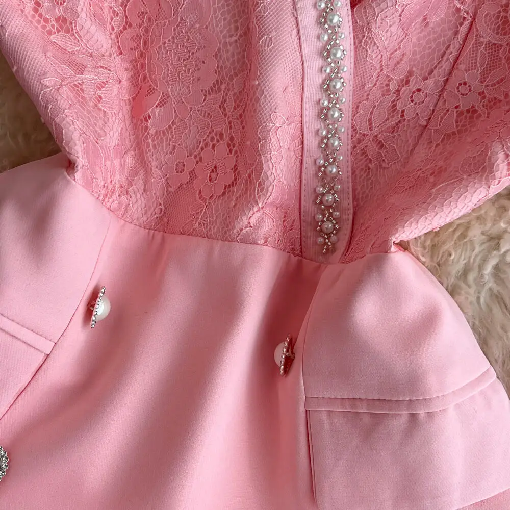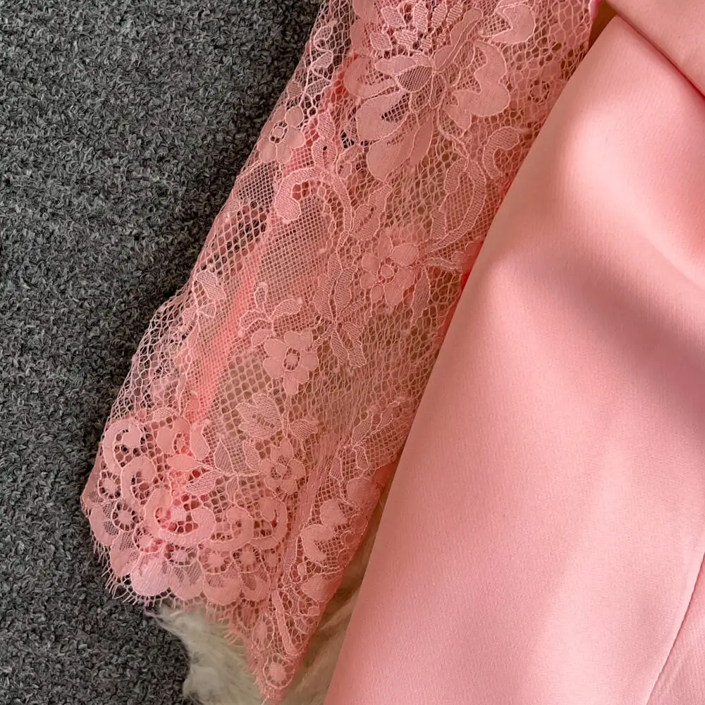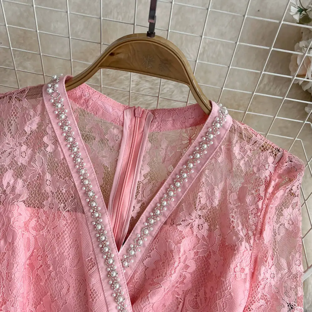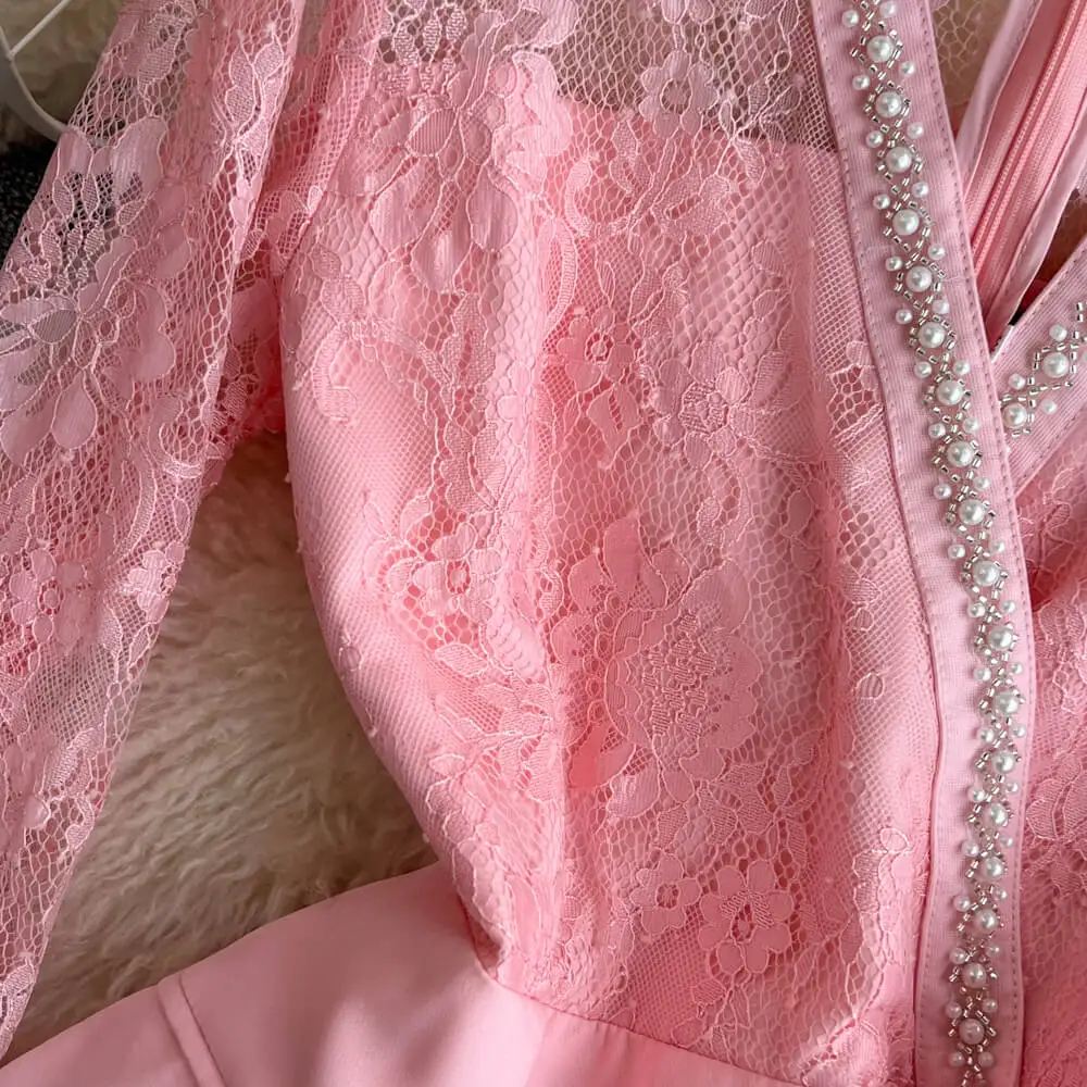 New Autumn Socialite Style OL Professional Long Sleeve Beaded V-Neck Lace Spell Receive Waist Slimming Mid-Length Split Dress