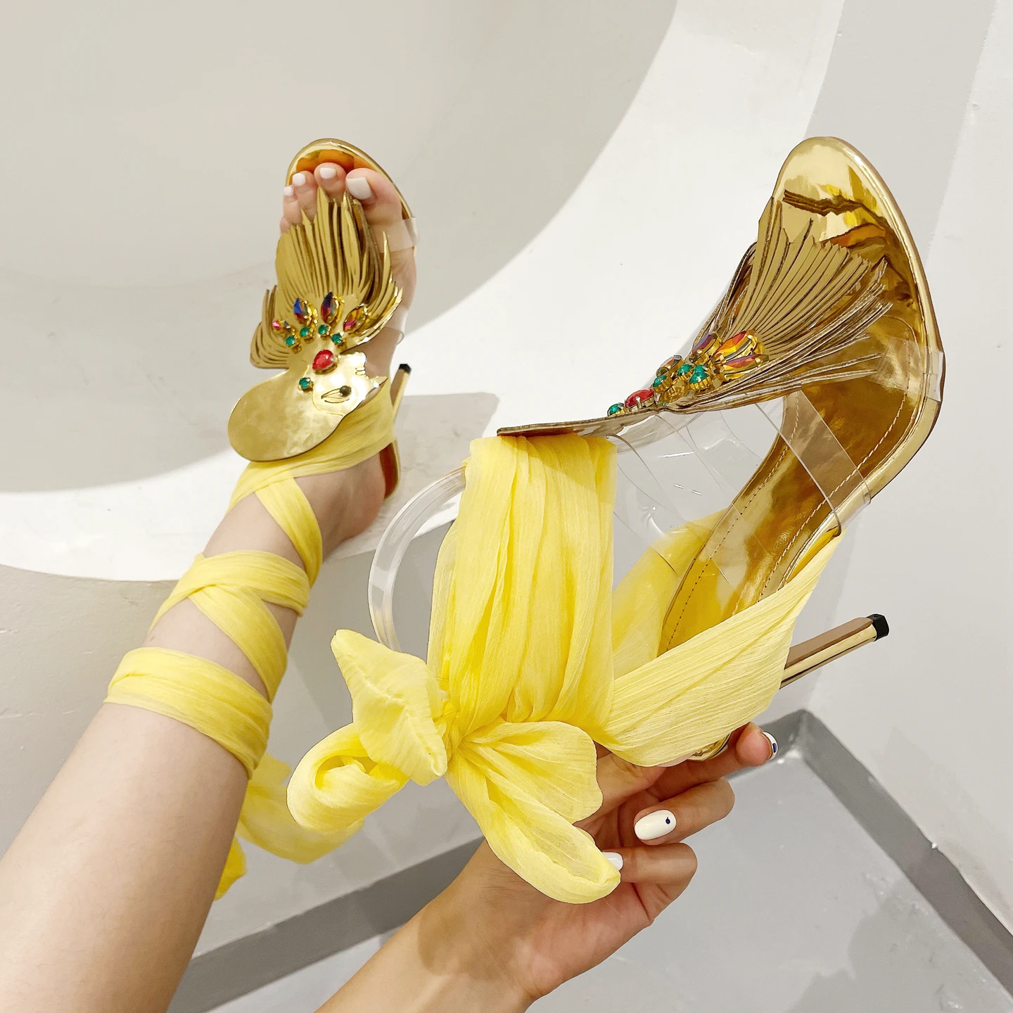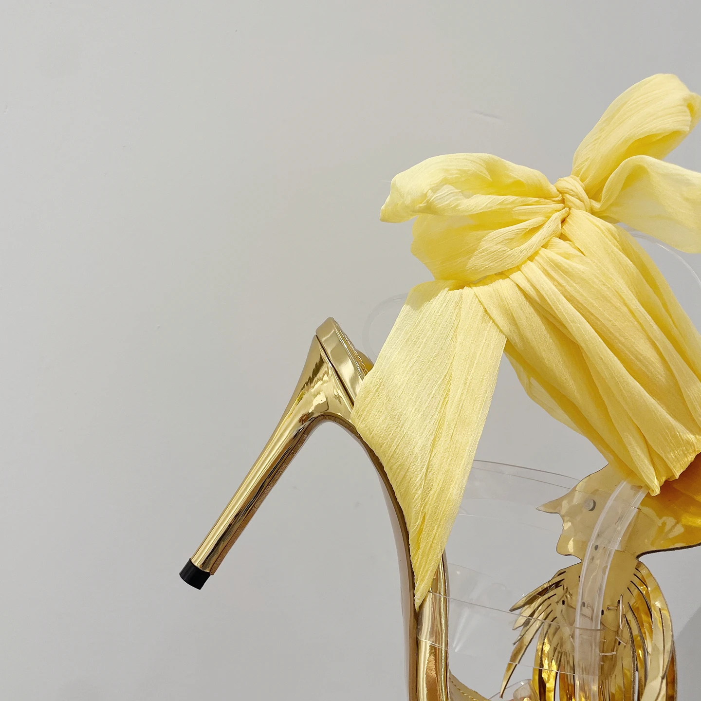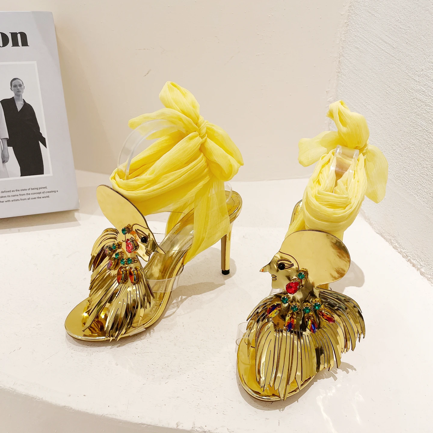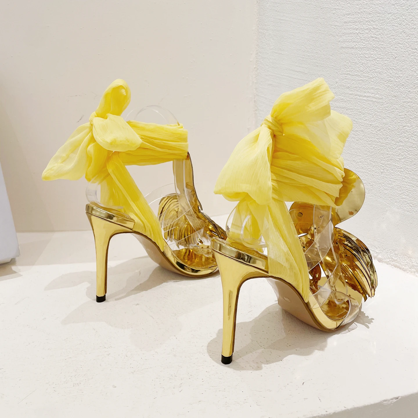 New Bow Knot Gold Sandals Ankle Buckle Peep Toe Stilettos Women High Heel Sandals Green Pink Red Summer Shoes For Women Sandals
