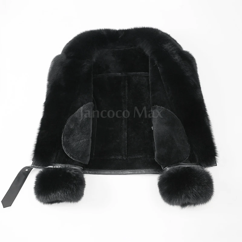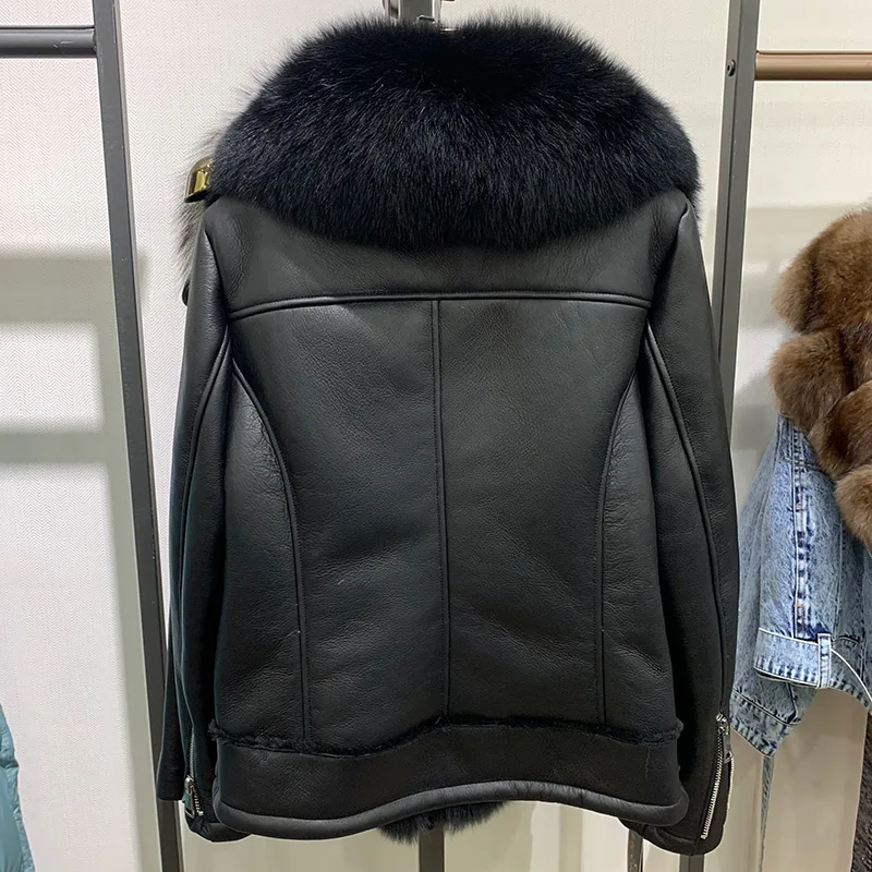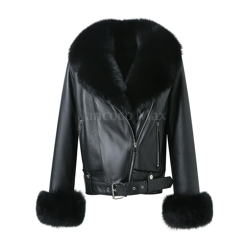 New Coming Fox Fur Collar Fur Jacket Women Black Genuine Leather Jacket with Fox Fur