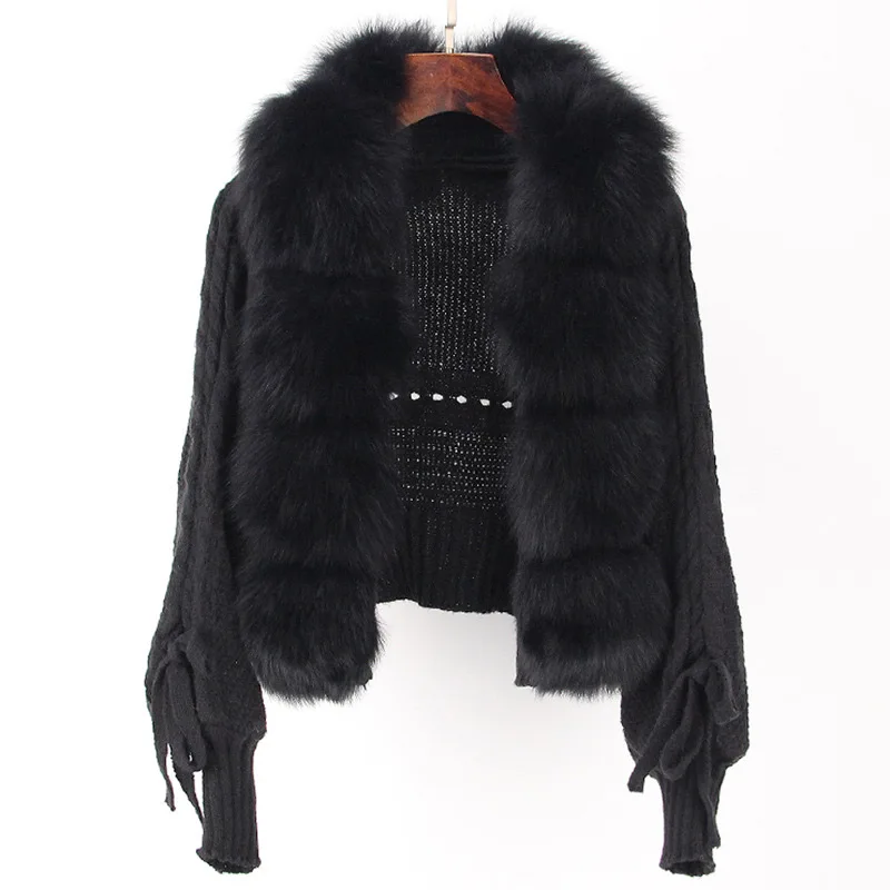 New Coming Real Fox Fur Collar Luxury Winter Sweater Women's Cardigan