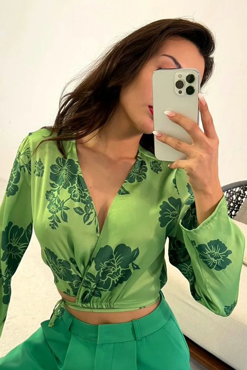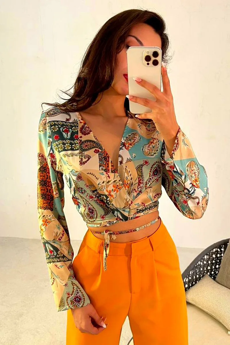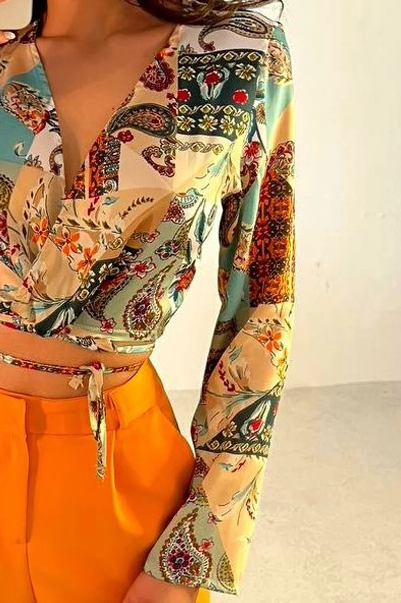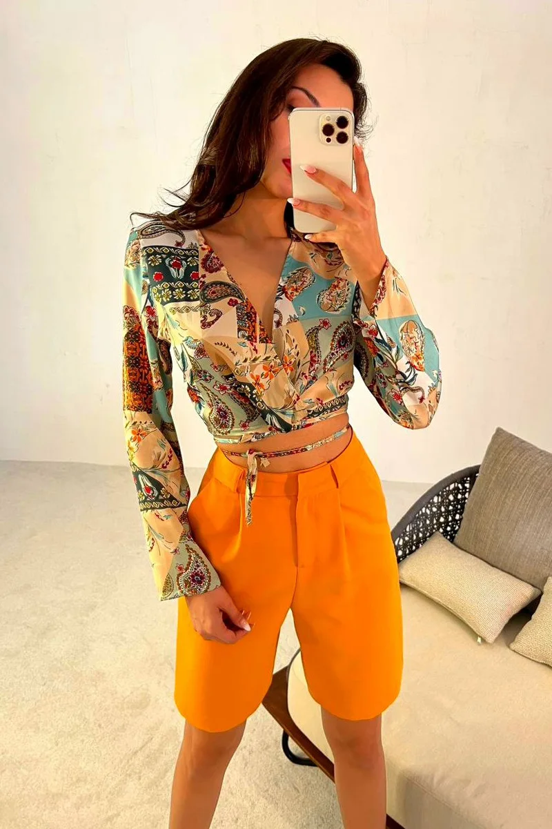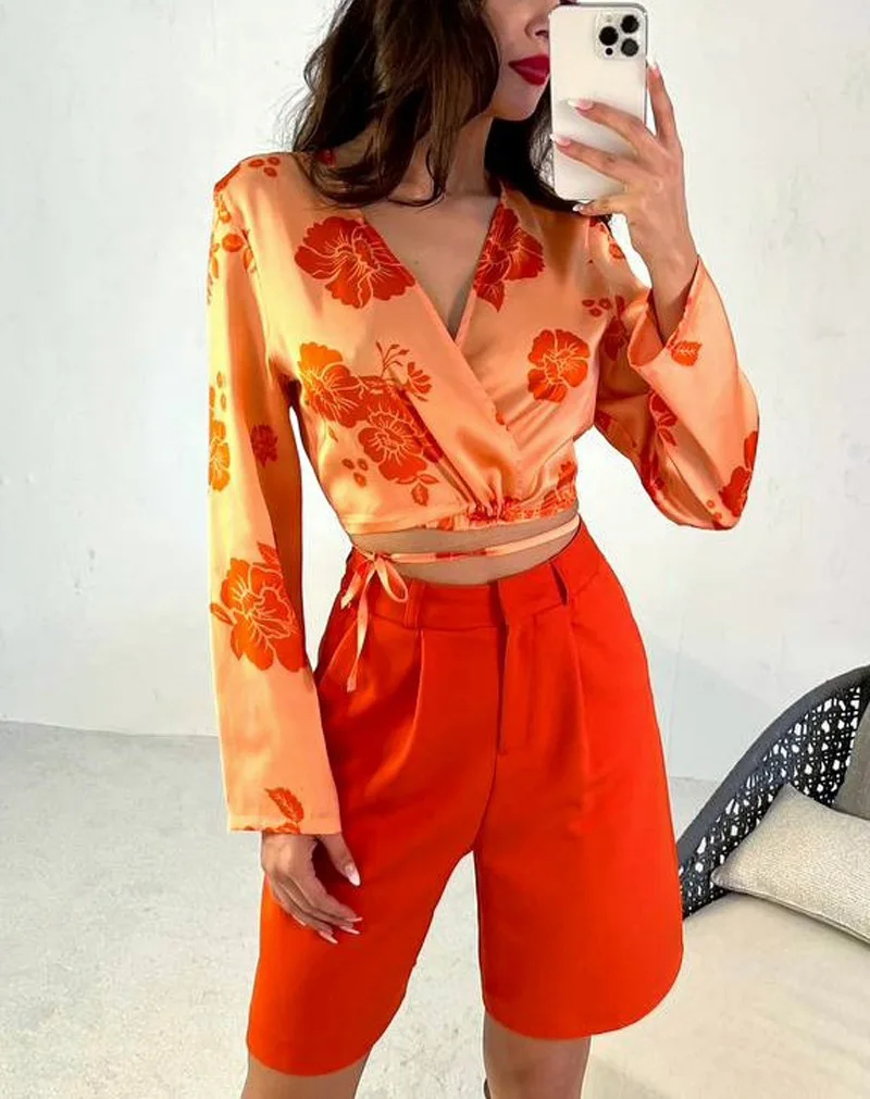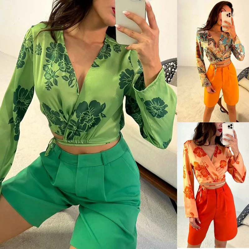 New cropped shirt shorts two-piece summer print v-neck women sexy tie dyed set