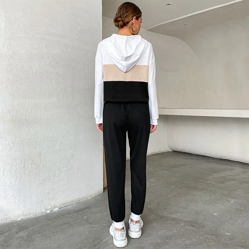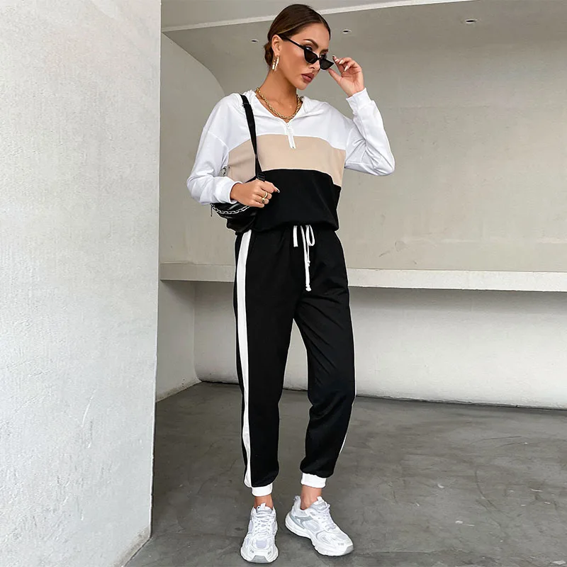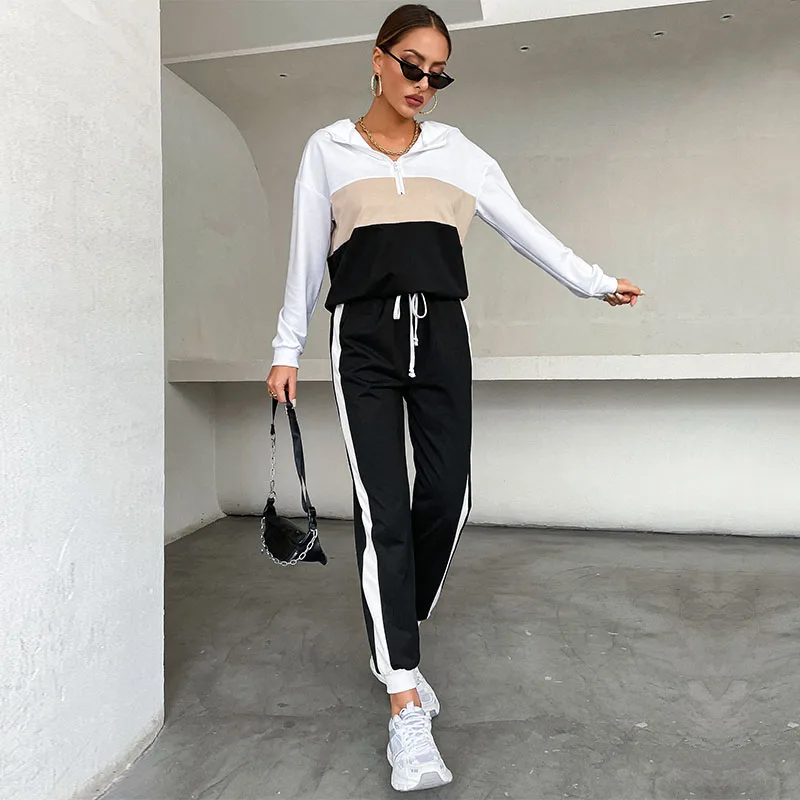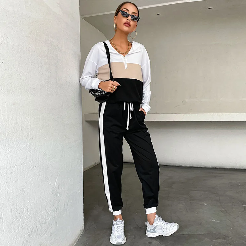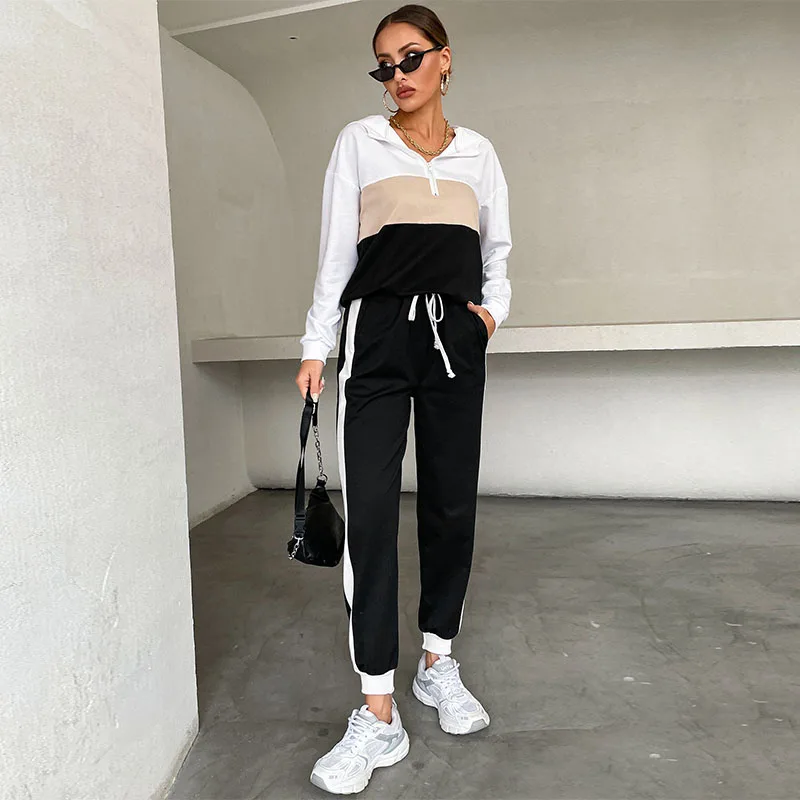 New Customized Oversized Casual Color Splicing Zipper Two Pieces Pullover Sweatshirt Set