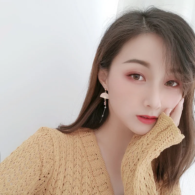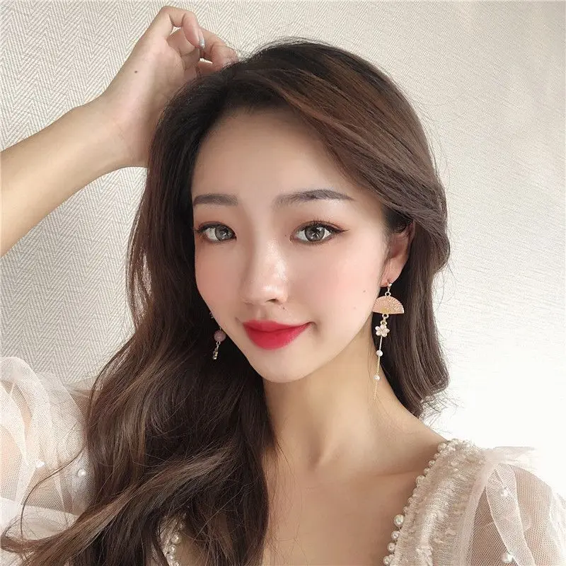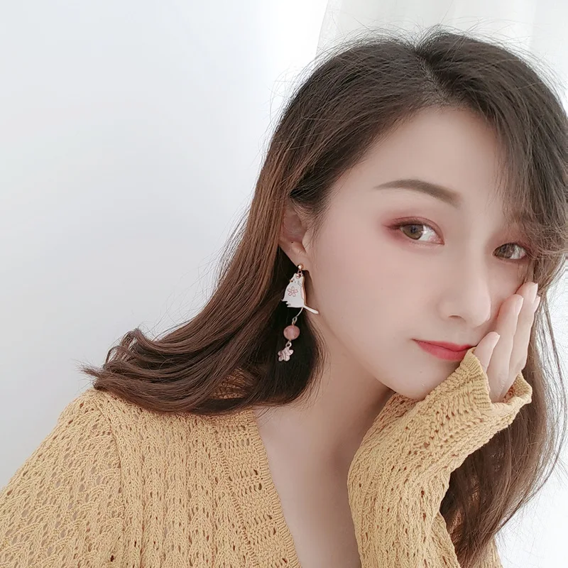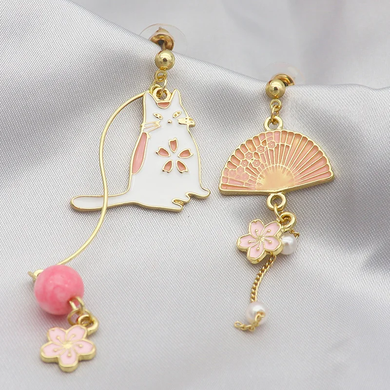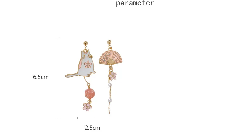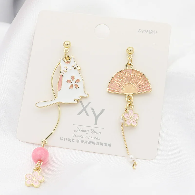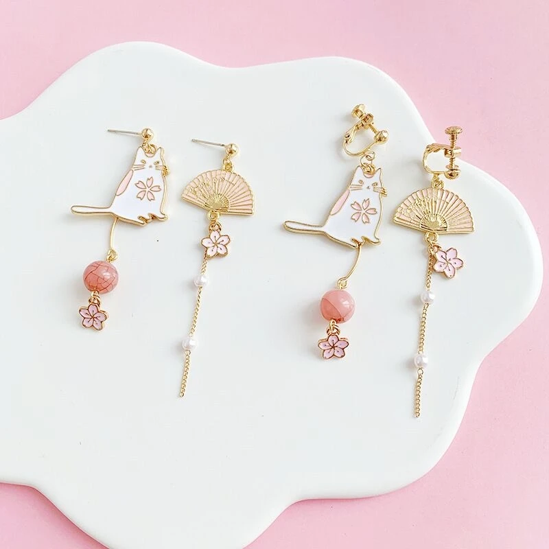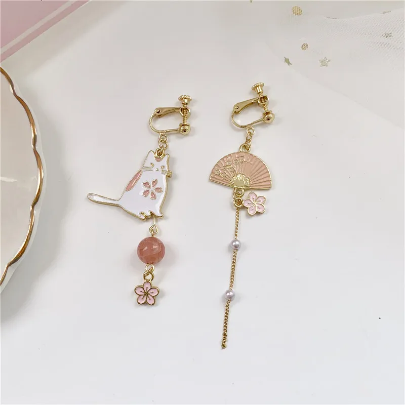 New cute cat fan asymmetrical earrings girl flower tassel ear clip pink sweet style jewelry for women gift