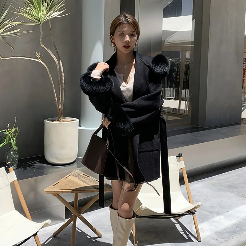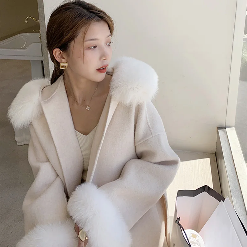 New Design Double Loose Size Wool Coats Women Cashmere Coat With Fur Fox Hood
