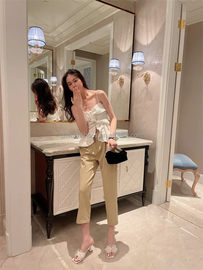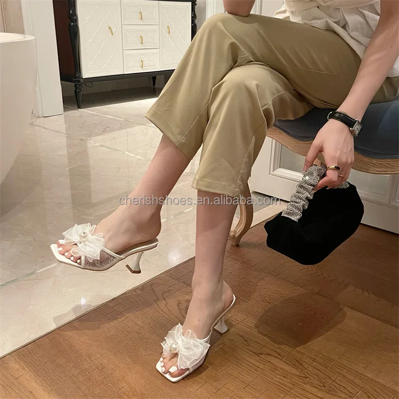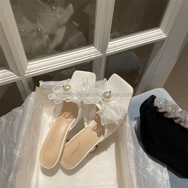 New design elegant women front yarn bow Pearl romantic dream girls comfortable open square toe mid thin stiletto heels flats