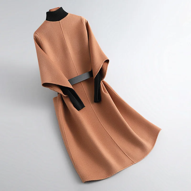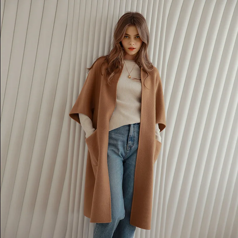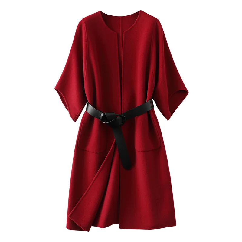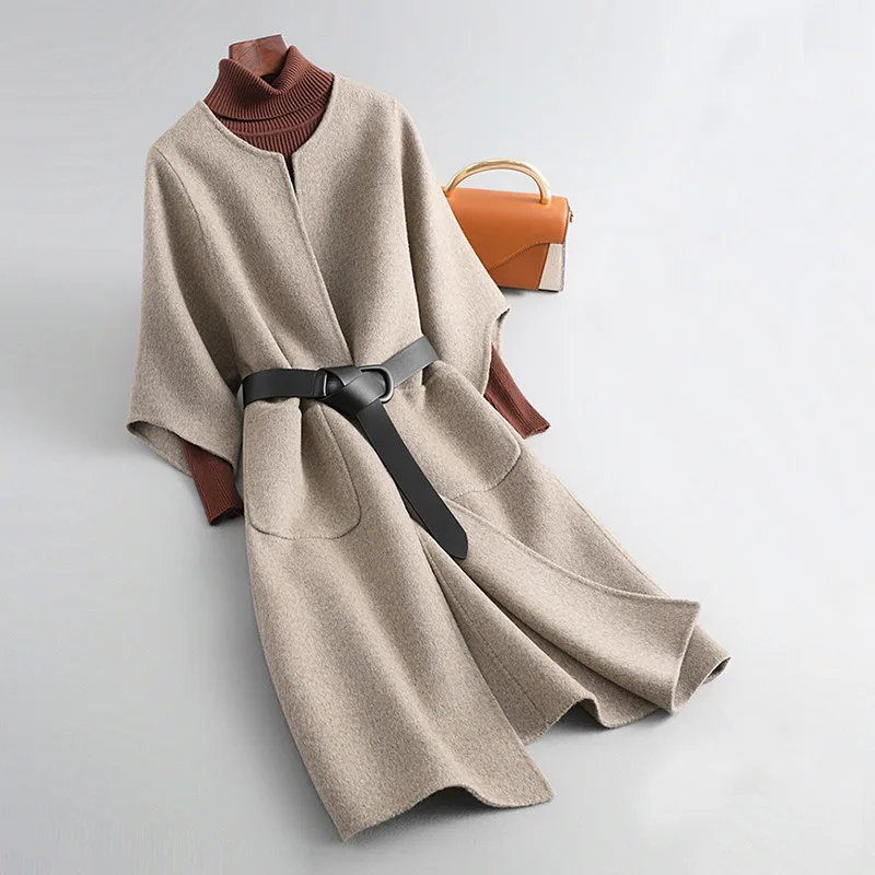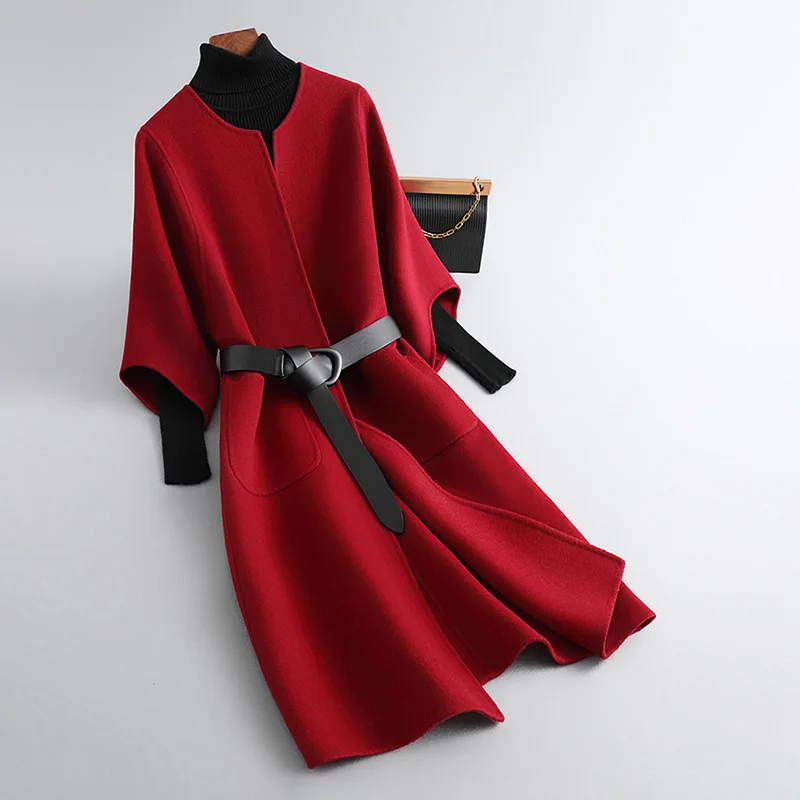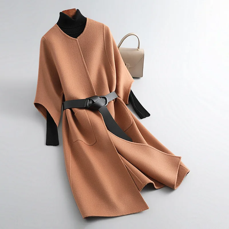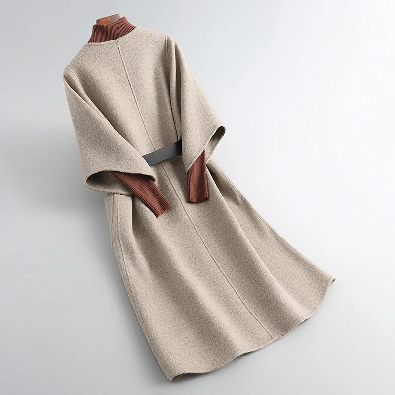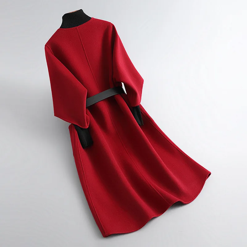 New Design Solid Color Double Faced Winter Cashmere Long Wool Coat Women with Blet