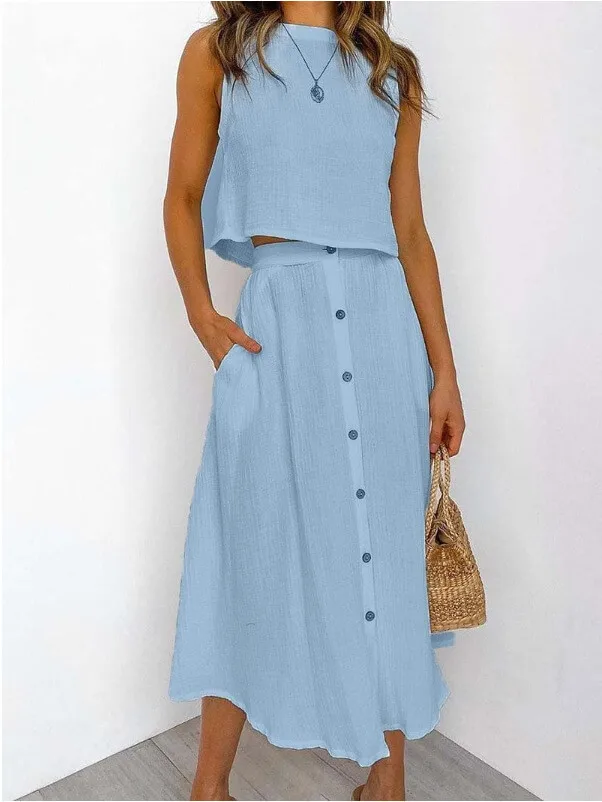 New Double layered Wrinkled cotton Round Neck Tank Top Shirt Mid length Button Dress Two Piece Set