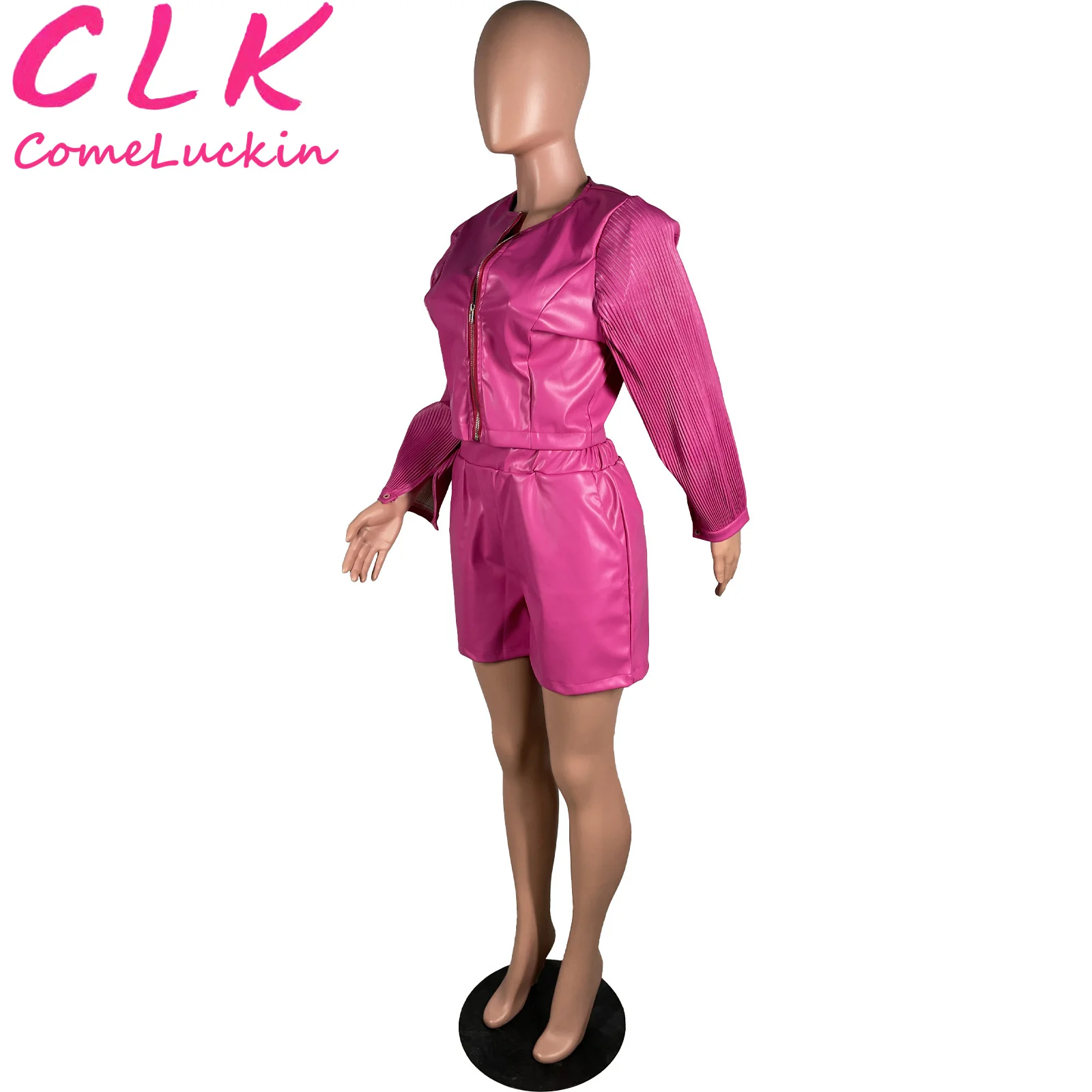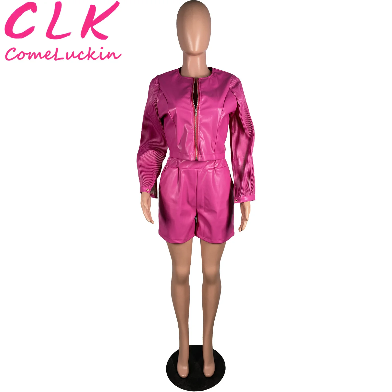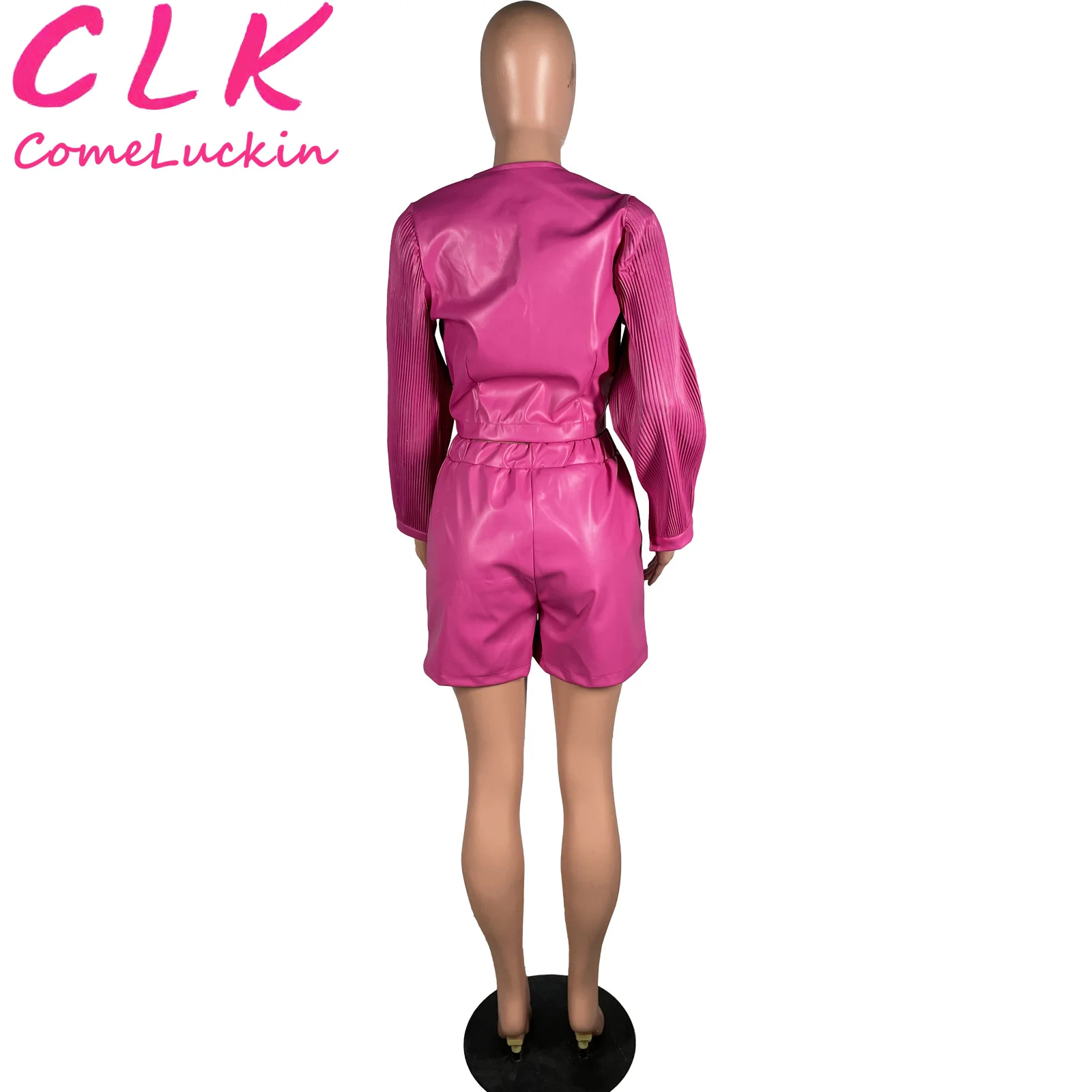 New Fall Crop Sexy PU leather motorcycle pleated long sleeve suit Women Two Piece Set stretch leather two pieces pants set