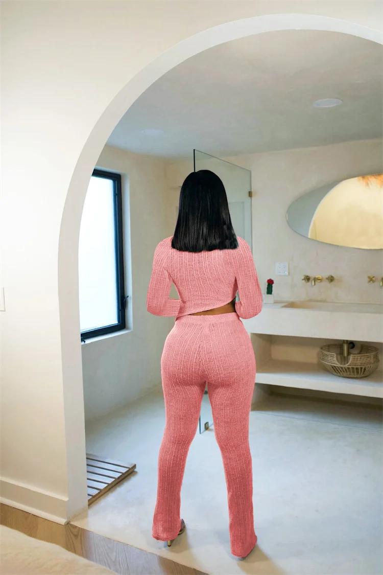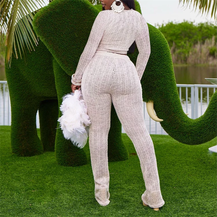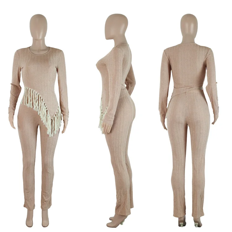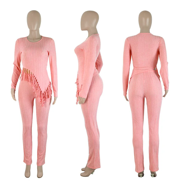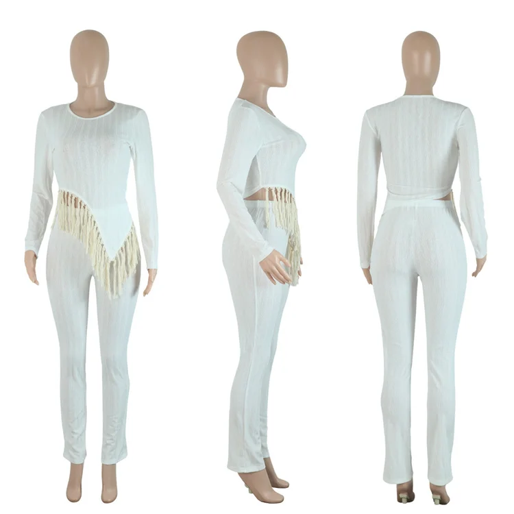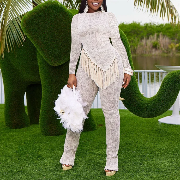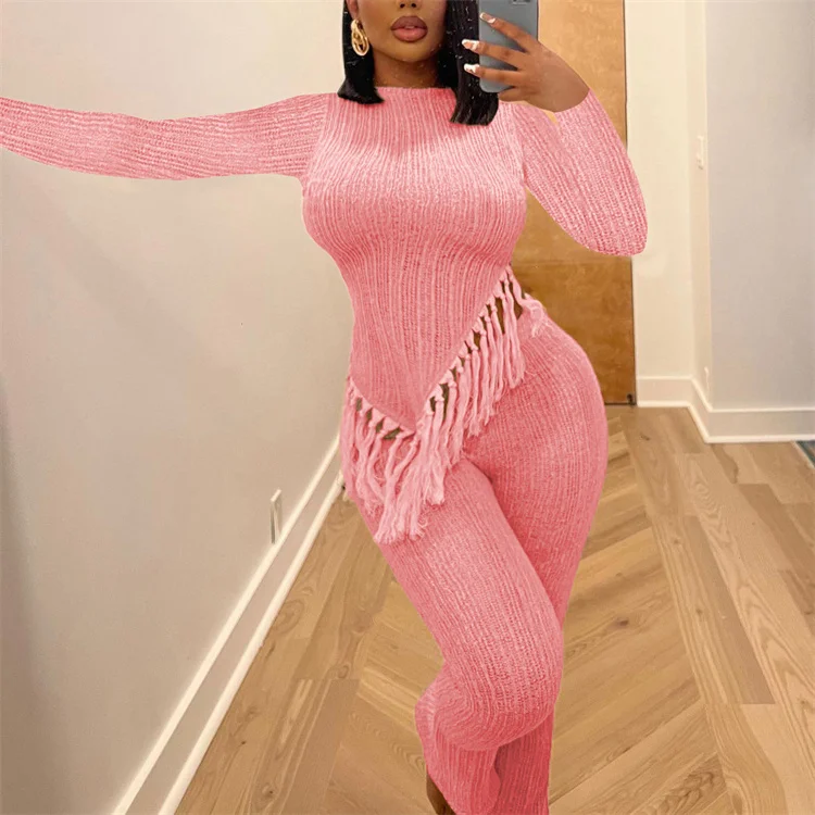 New Fall Elegant Tassel 2 Piece Set Women Casual Long Sleeve Irregular Top + Pants Knitted Streetwear Matching Sets