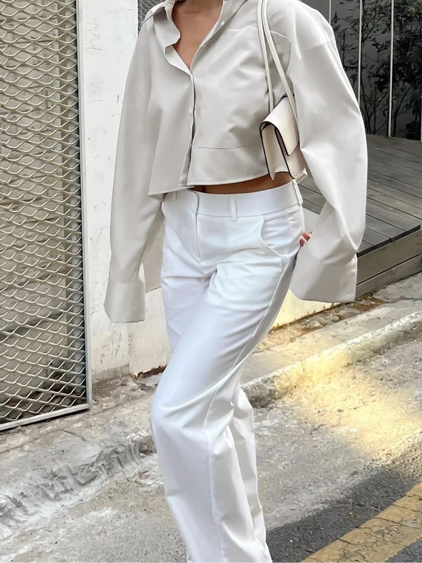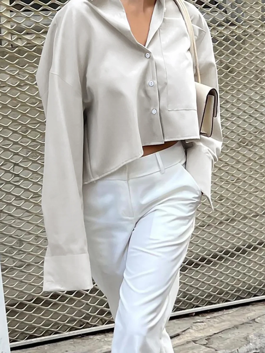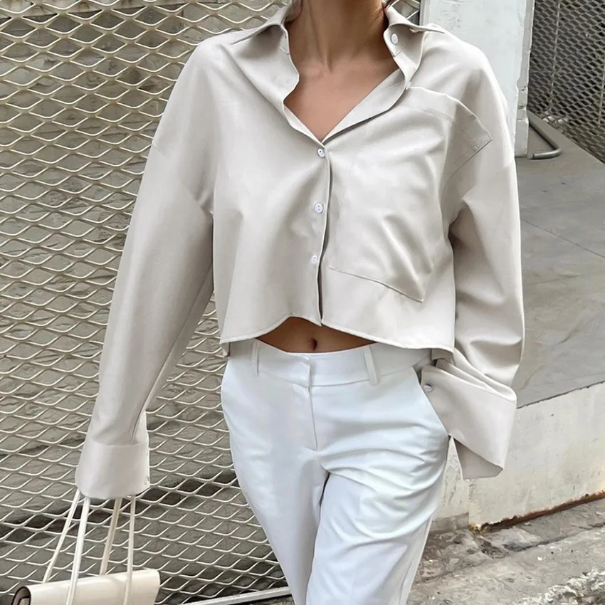 New Fashion Foreign Trade Autumn Khaki Lapel Long Sleeve Commuter Short Crop Ladies Temperament Shirt