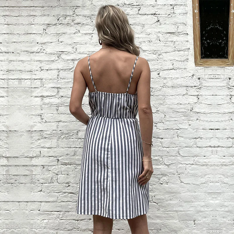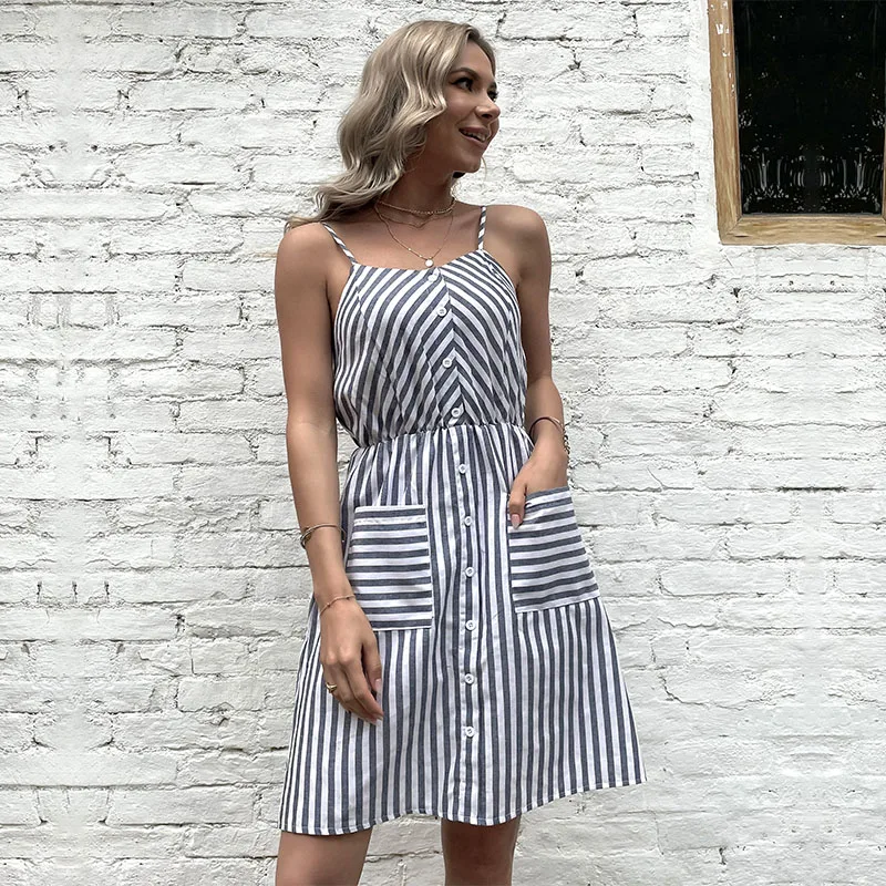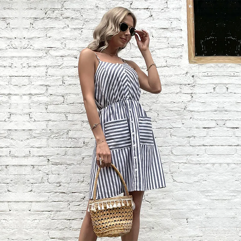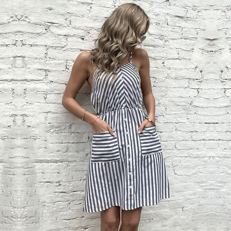 New Fashion Ladies Spaghetti Strap Loose Dress Women Casual Pocket Backless Women Short Sleeve Stripe Shirt Dress