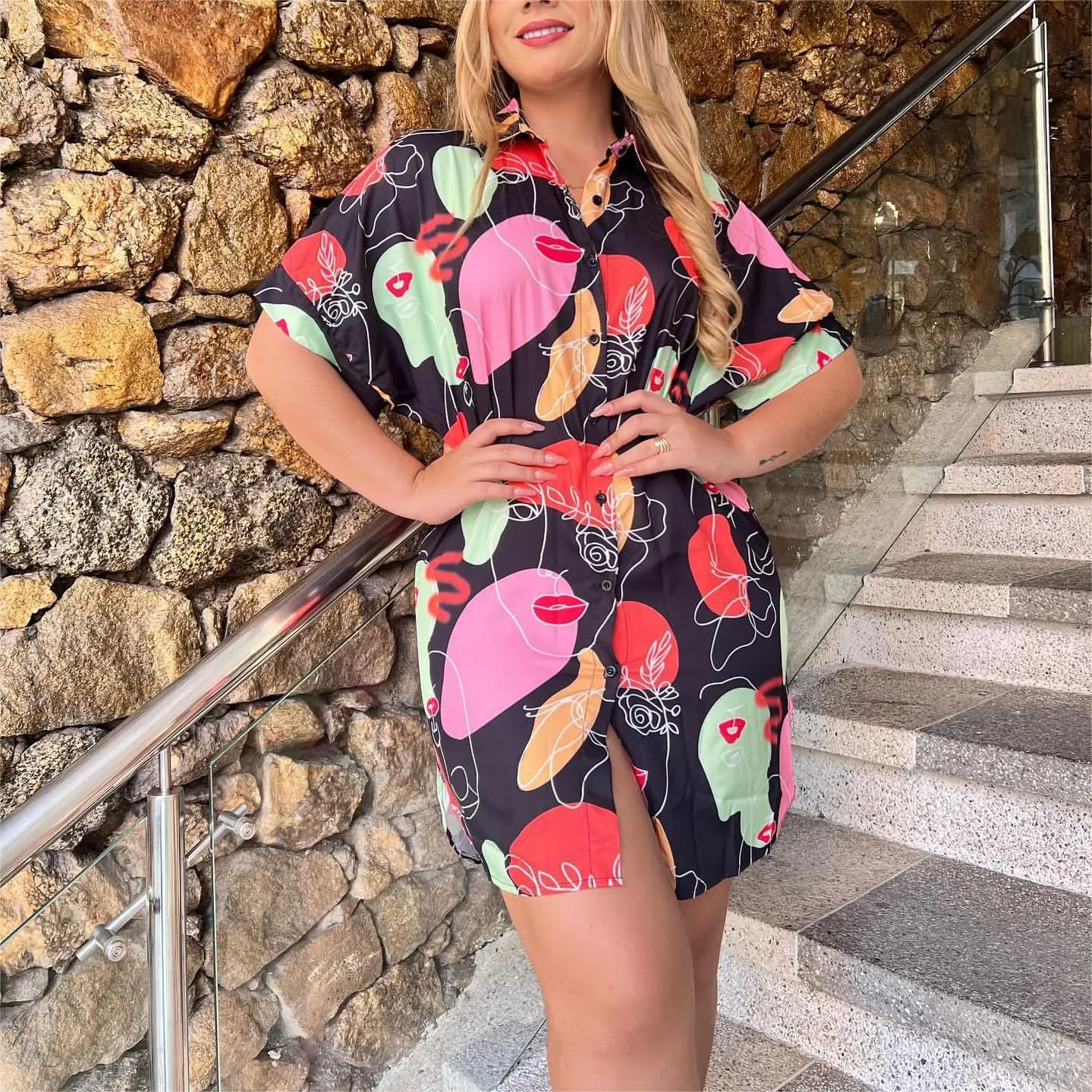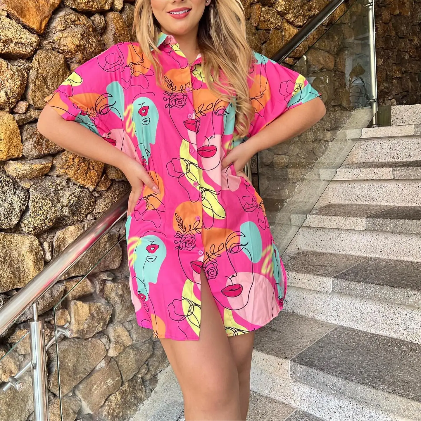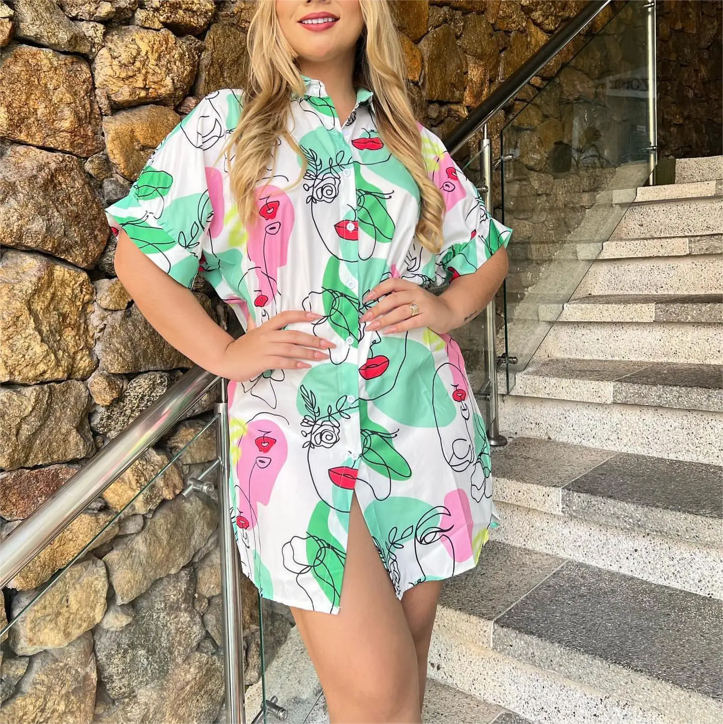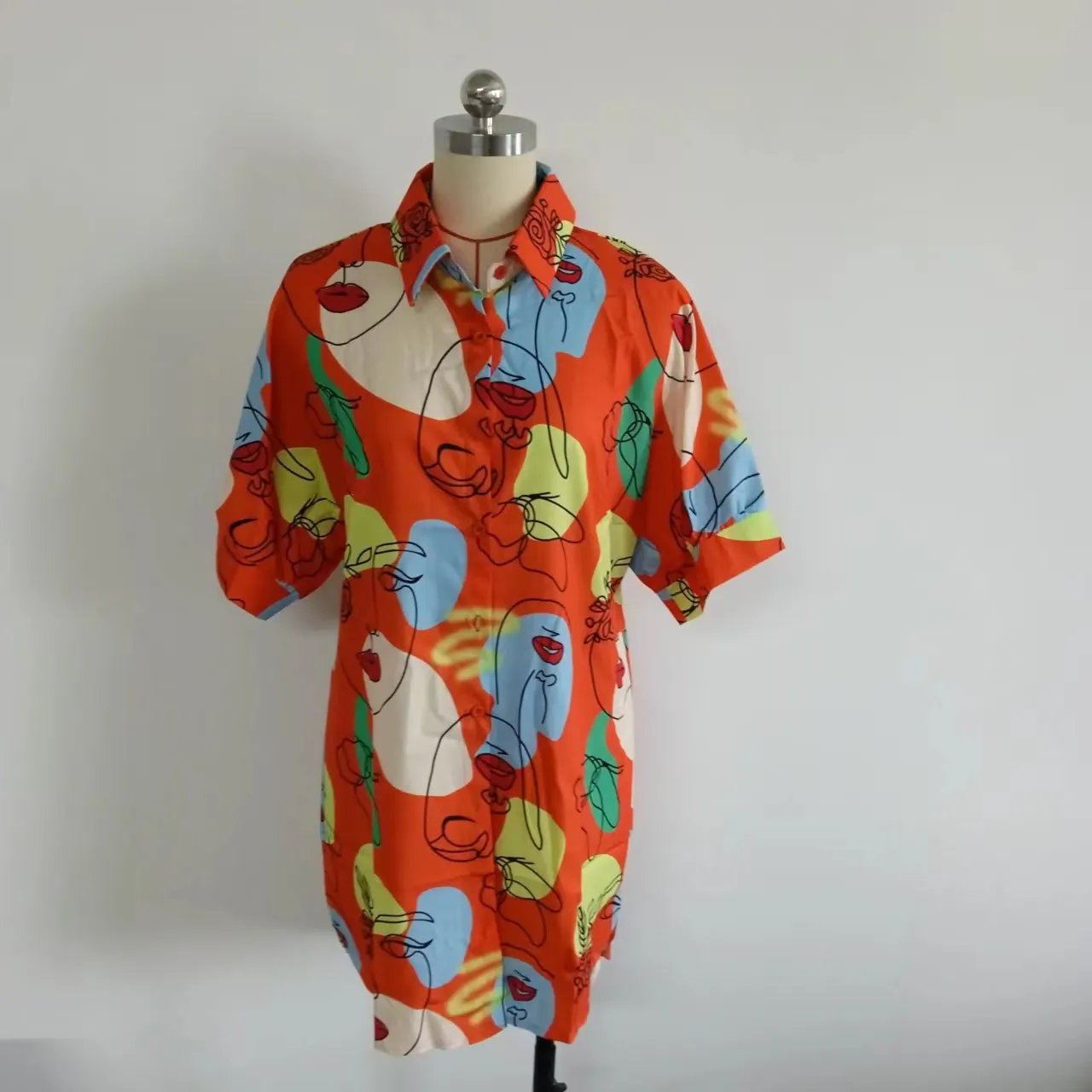 New Fashion V-Neck Personalized Cartoon Printing Slim Fit Shirt Dress Ladies Casual Midi Dresses