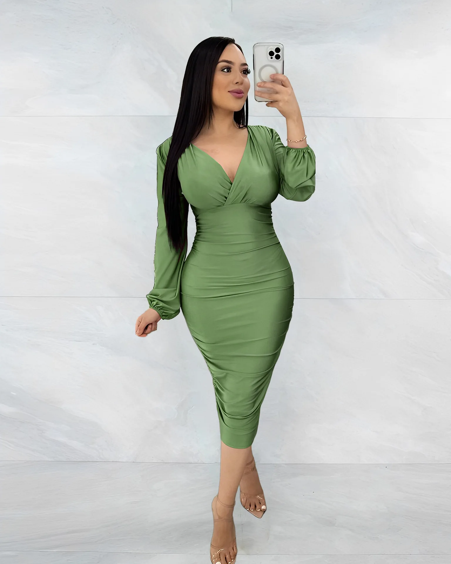 New Fashion Women Europe Sexy Lady Cross V-neck Fashion Pleated Dress Long Sleeve Women's Slim Evening Party Pencil Casual Dress