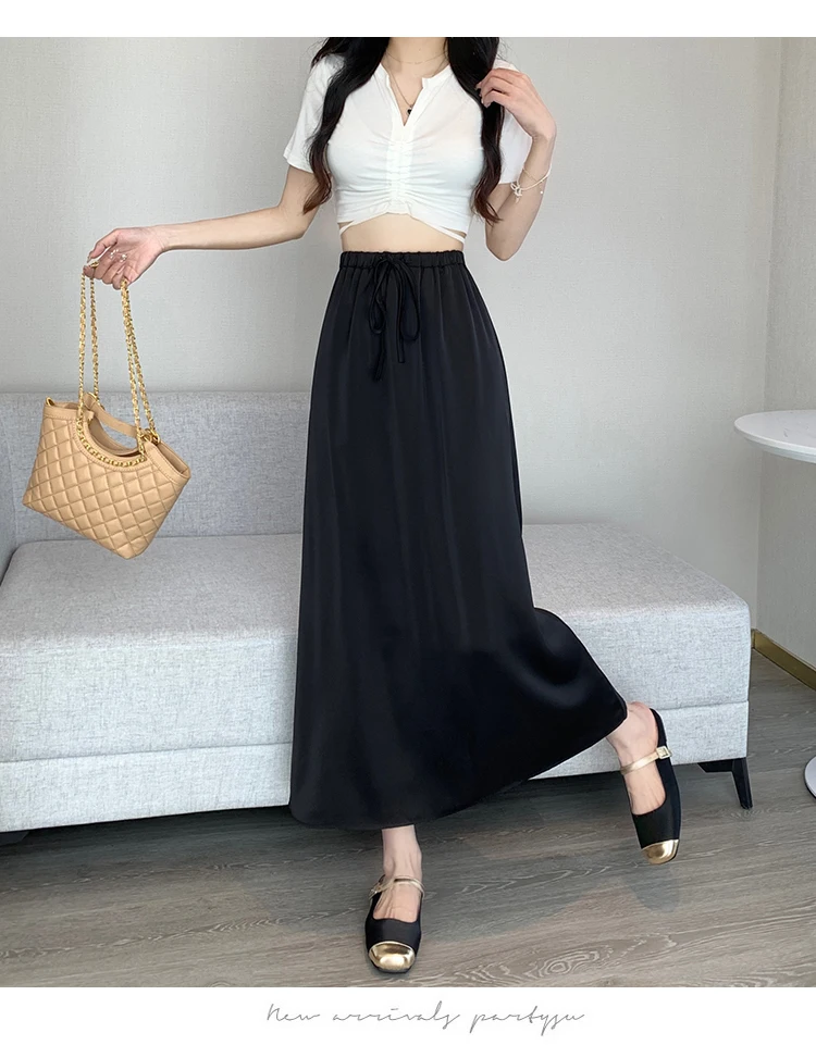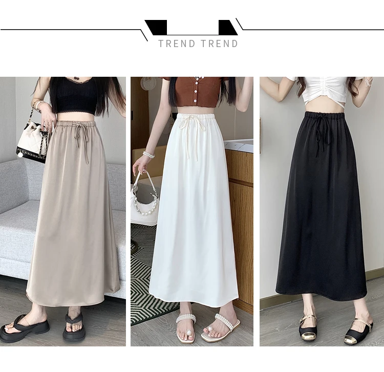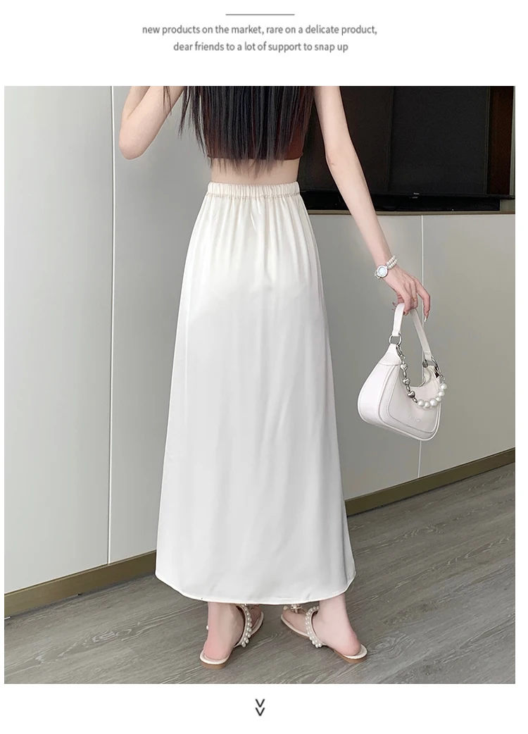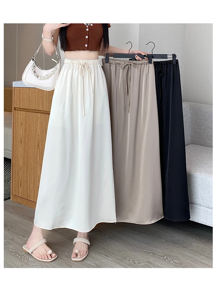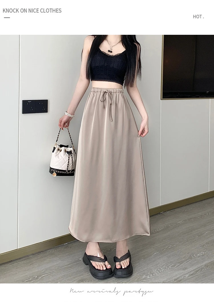 New Fashion Women Satin Long Mid-length Skirts Elegant Elastic Waist Summer Office Ladies A-line Faldas Female Korean Slim Skirt