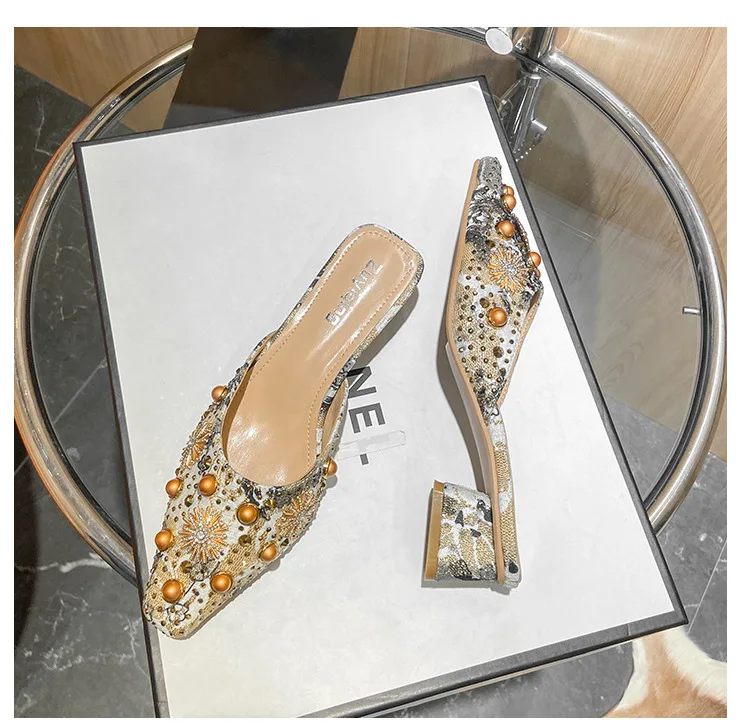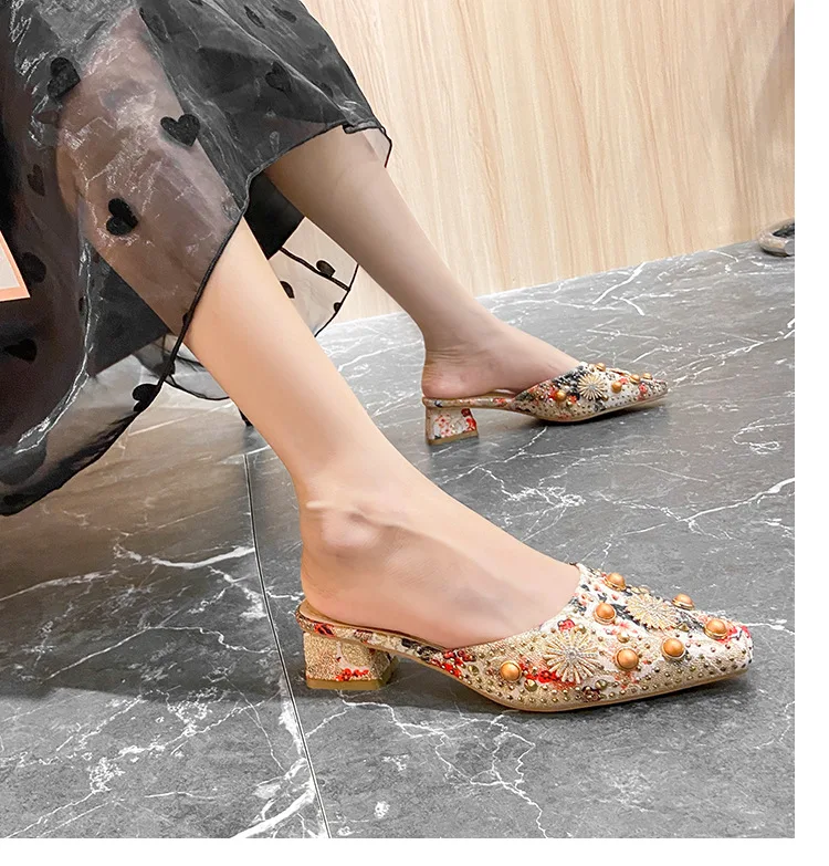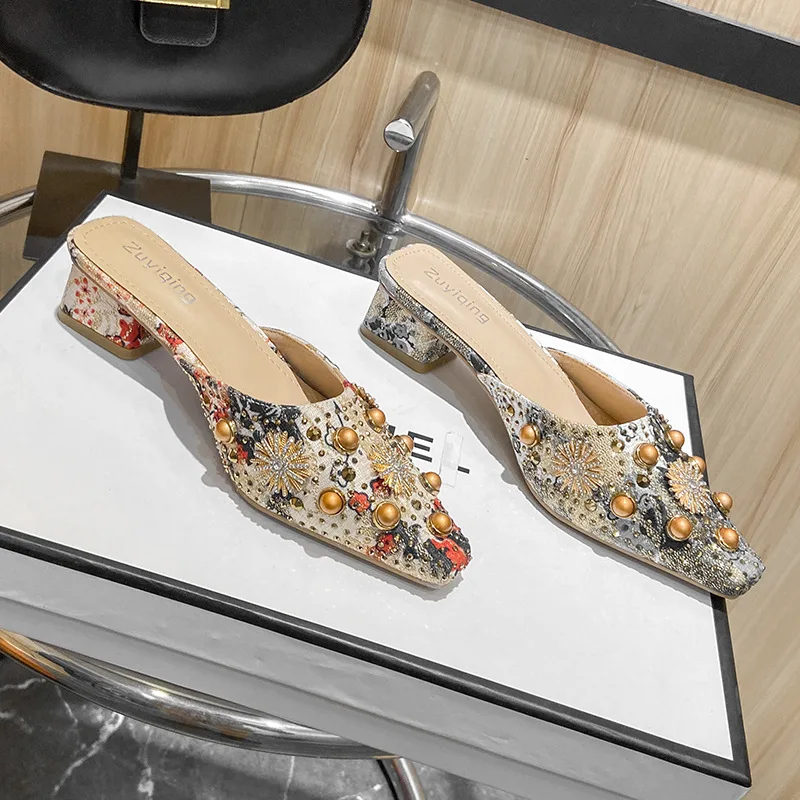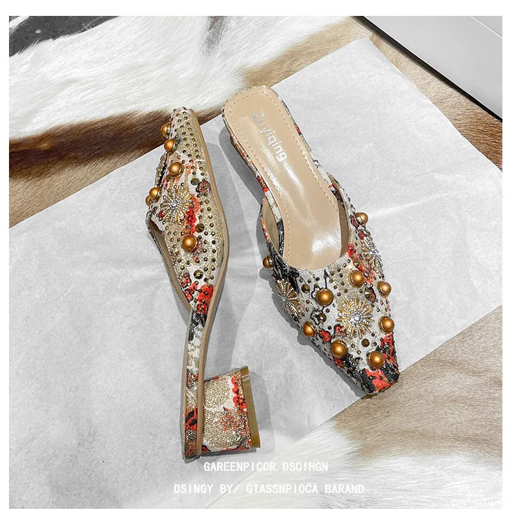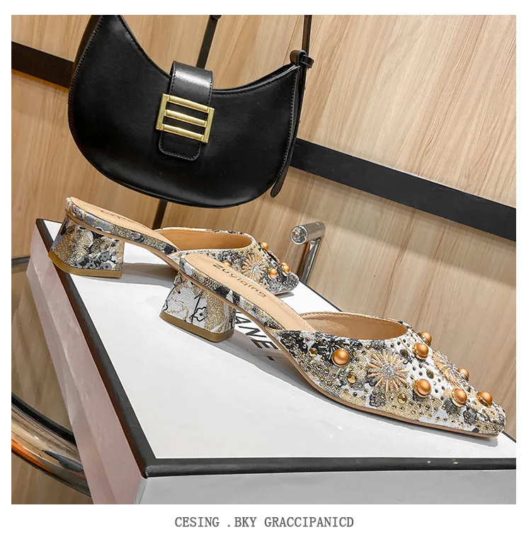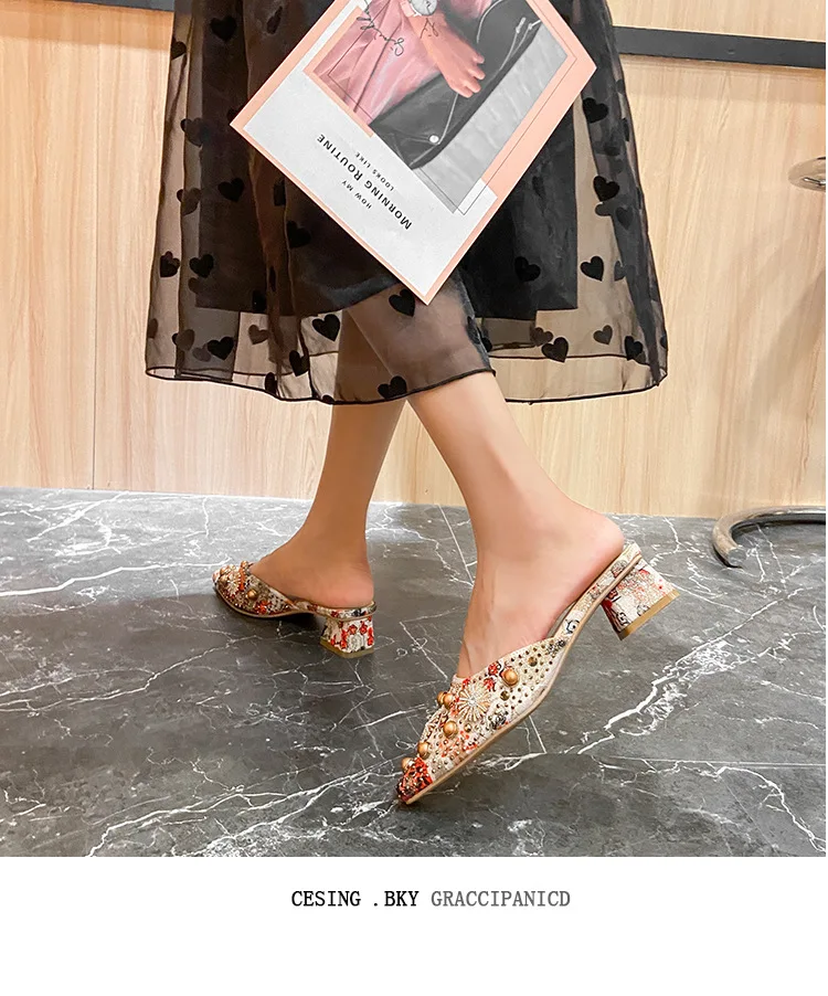 New Female Square-toe Silk Satin Sandals Spring Summer Block Heels Outside Hollow Out Daily Ladies Slippers