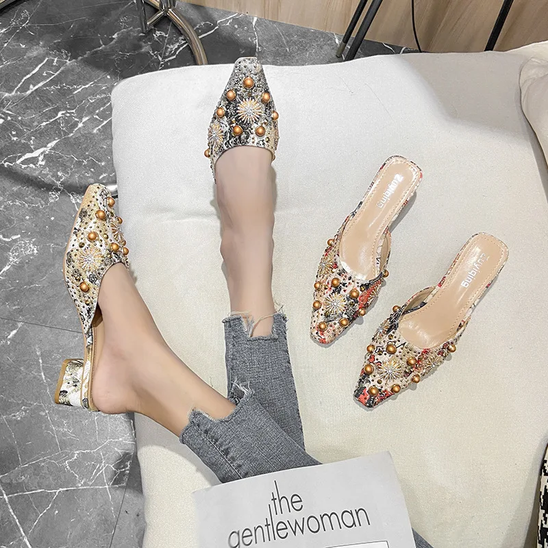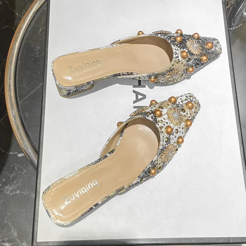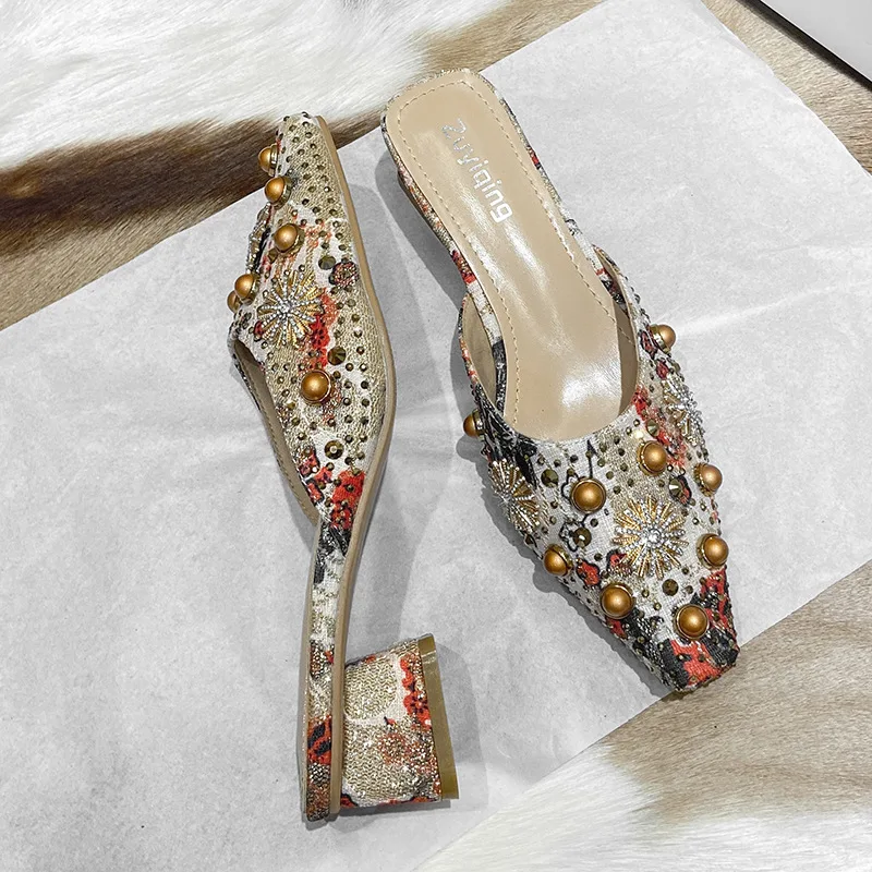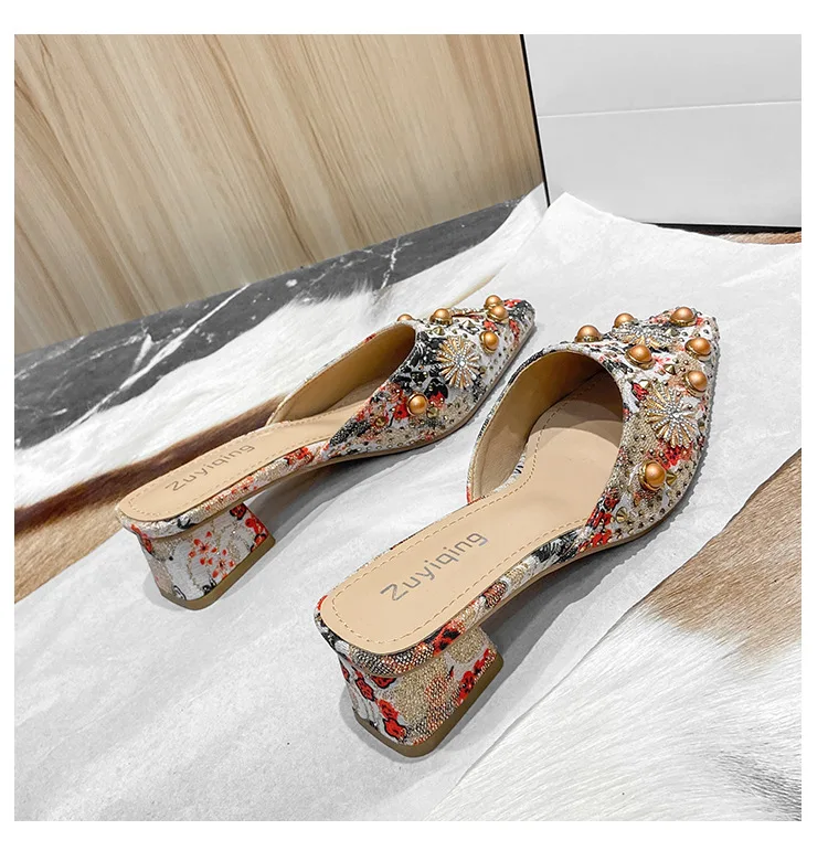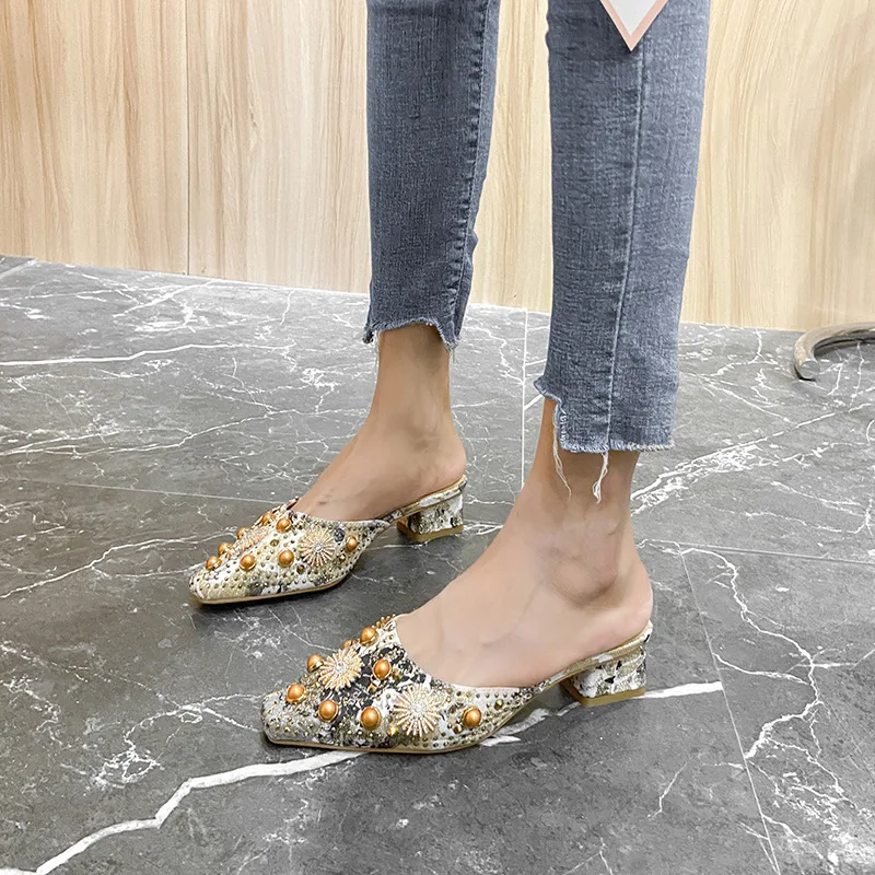 New Female Square-toe Silk Satin Sandals Spring Summer Block Heels Outside Hollow Out Daily Ladies Slippers