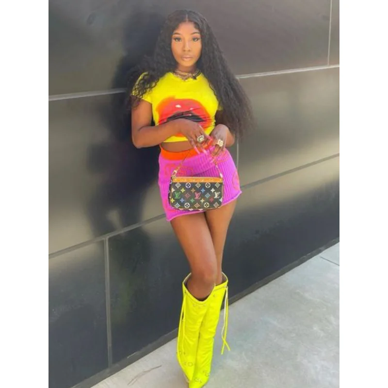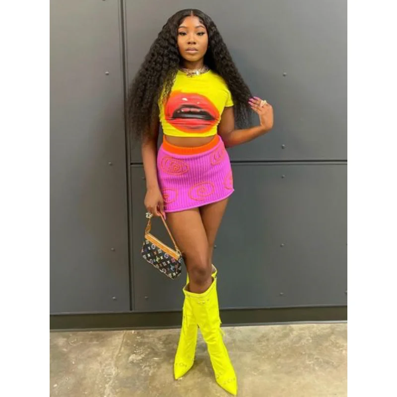 New Modern Mouth Printed Short Sleeve T-shirt Mini Skirt Suit 2023 Summer New Sexy Women Two Piece Skirt Set