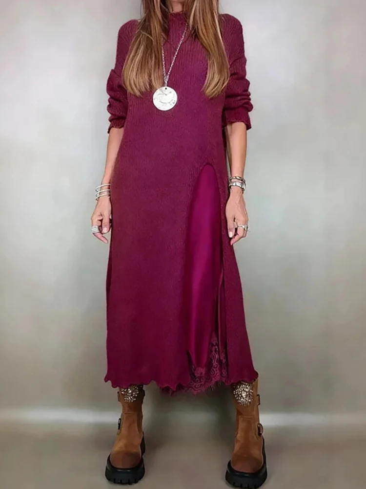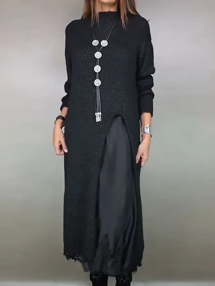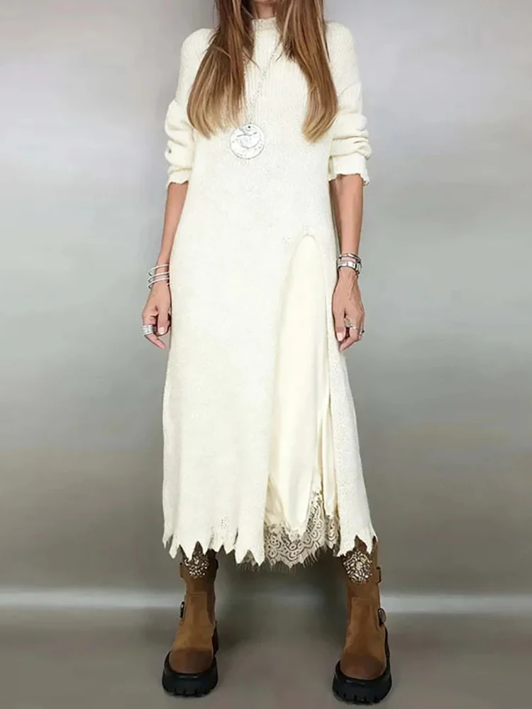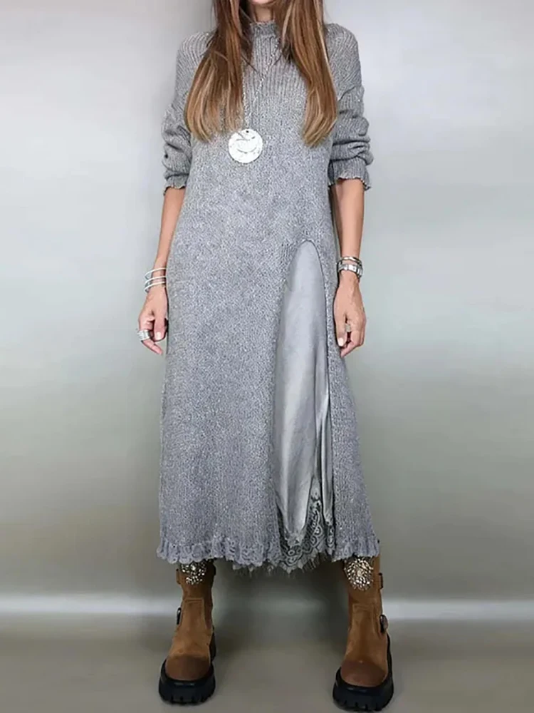 New O Neck Casual Holiday Long Sweater Dress Autumn Winter Women Long Sleeve Loose Pullovers 2025 Solid Patchwork Ladies Sweater