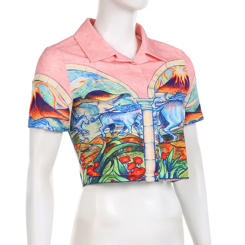 New Product Ideas 2023 Turn down Collar T-shirts Women Printed Polo Shirt Summer Vacation Beach Crop Tops