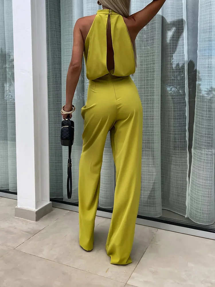 New Sleeveless Wide Leg Pants Playsuits, Women Summer Half High Collar Elegant Jumpsuits, Solid Patchwork Simple Ladies Bodysuit