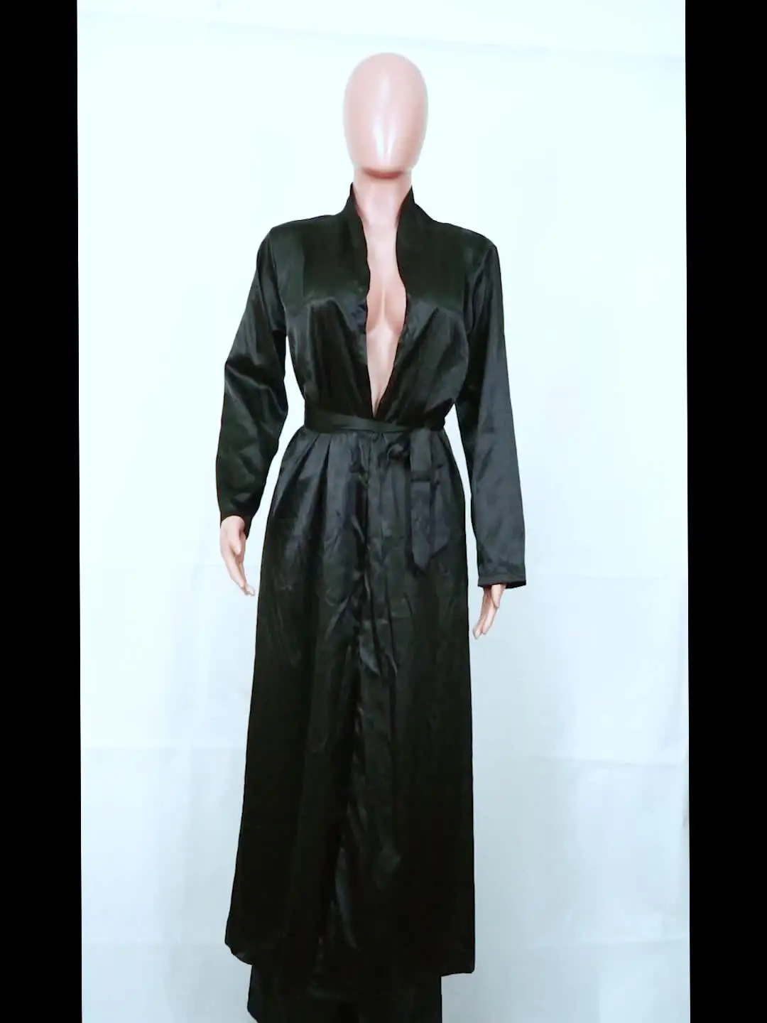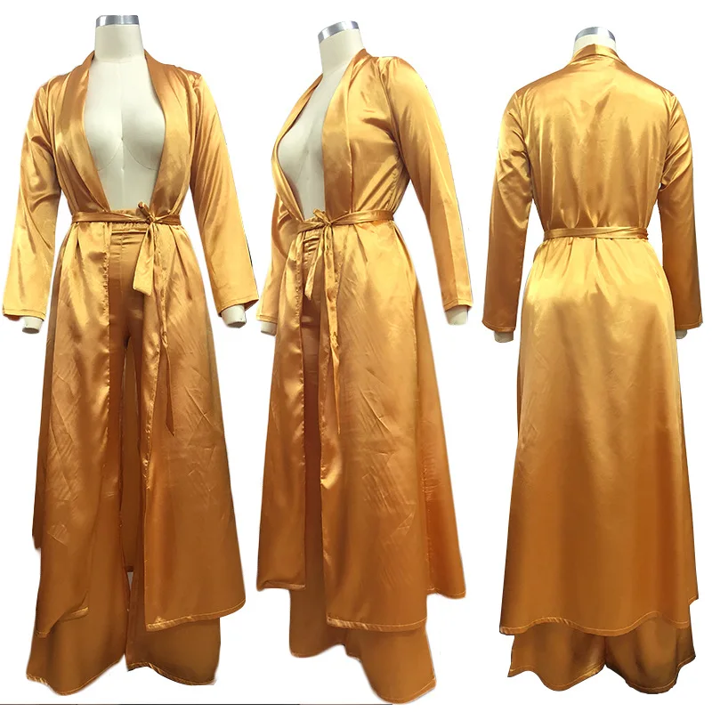 new style hot sell pure color two piece wide leg pants set silk robe cardigan jacket matching straight trousers 2 piece outfits