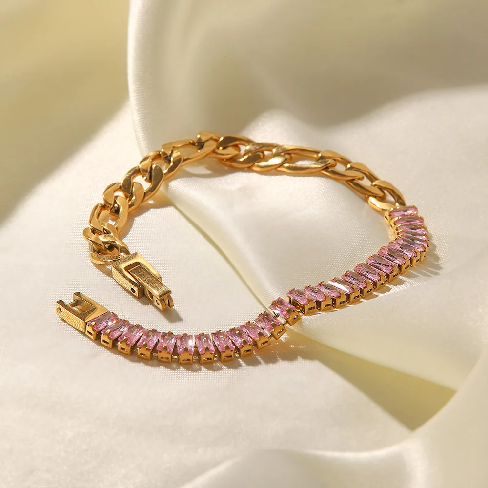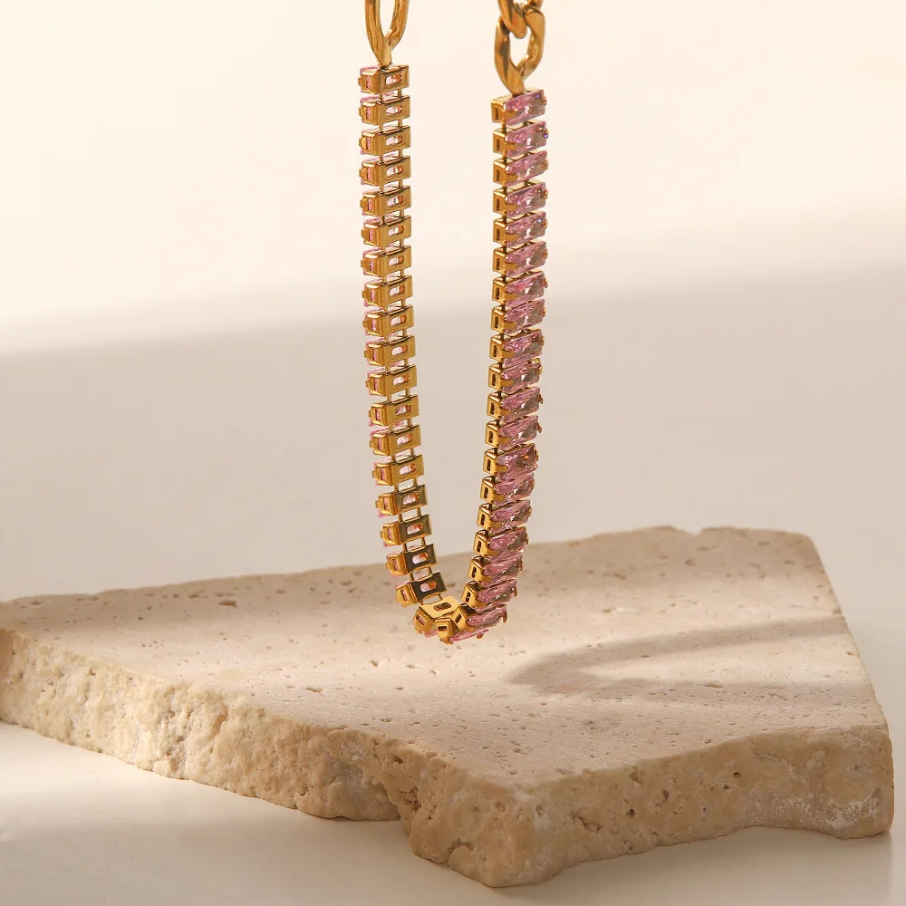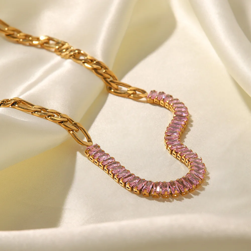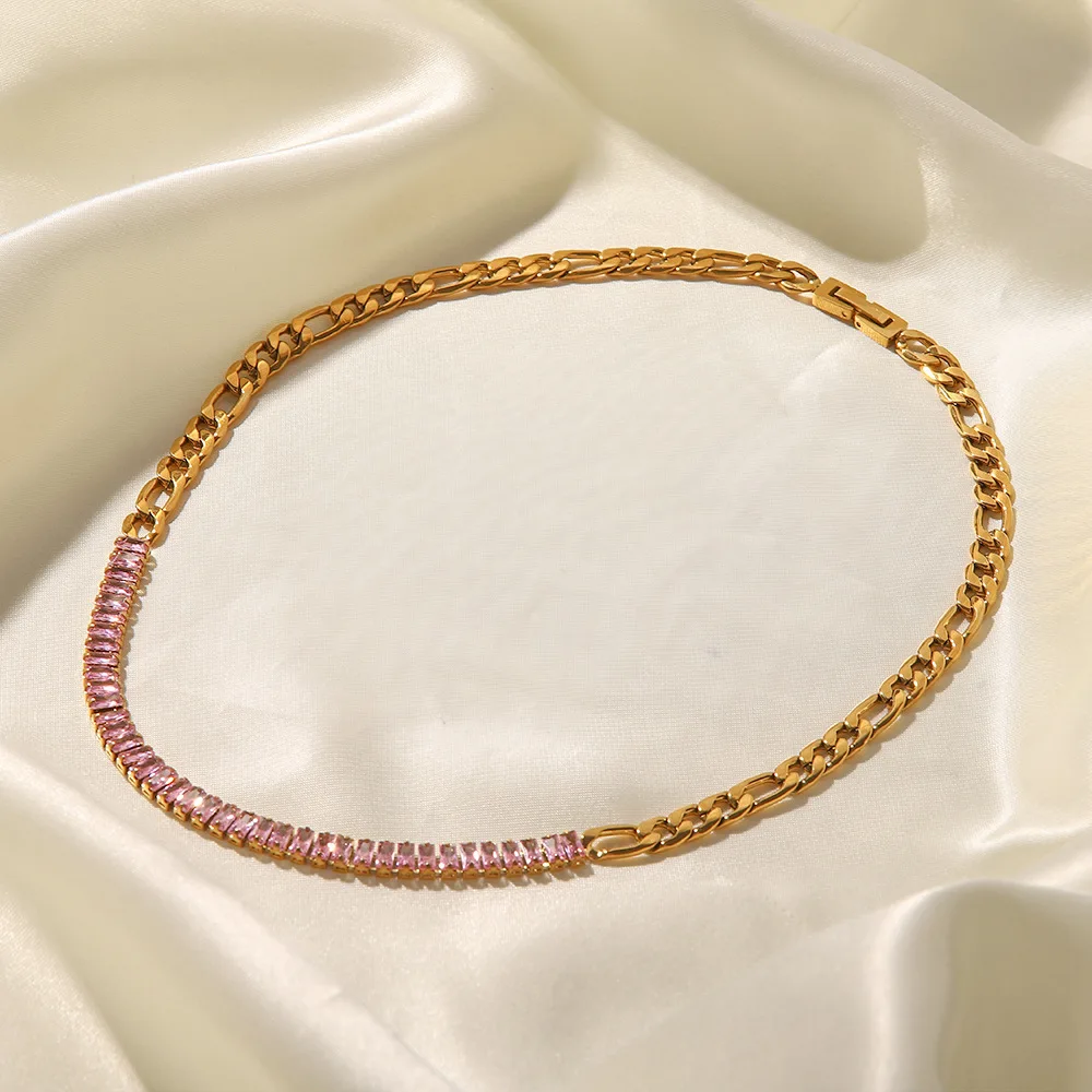 New Style Stainless Steel 18K Gold Plated Jewelry Pink Full Cubic Zirconia Figaro Chian Bracelet Necklace