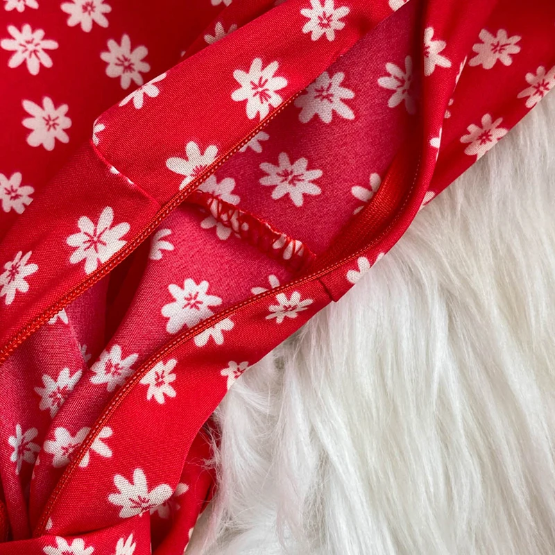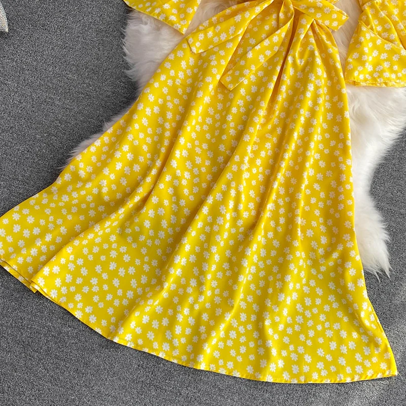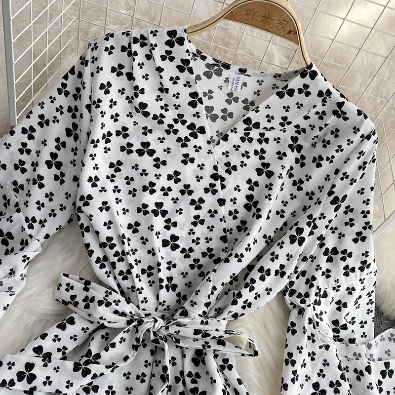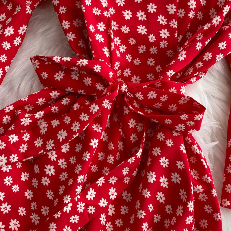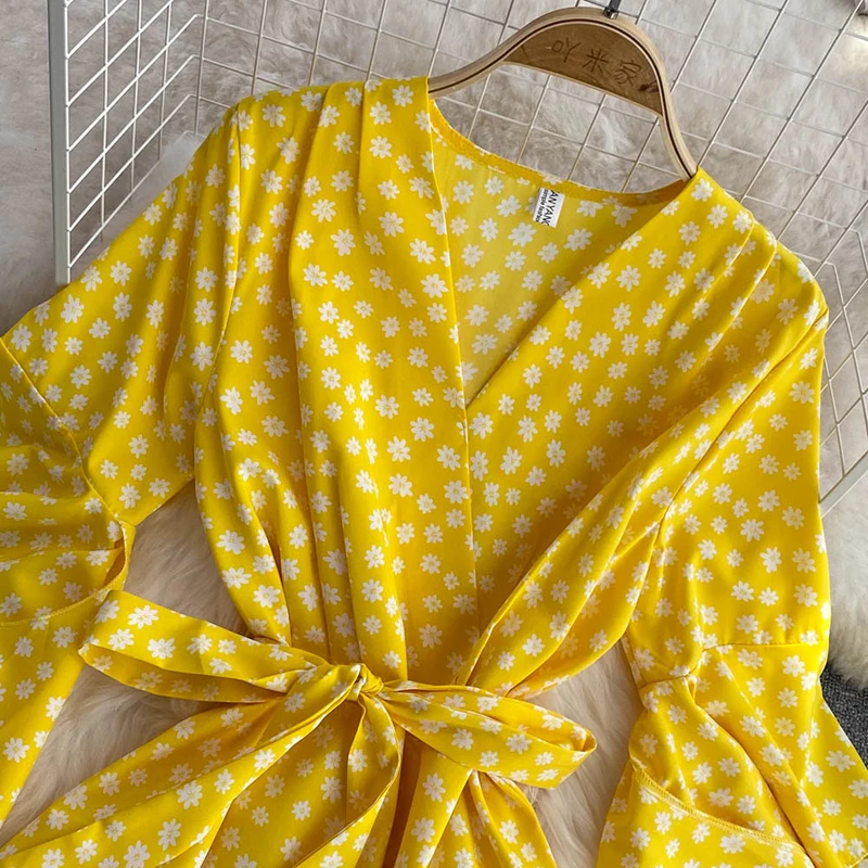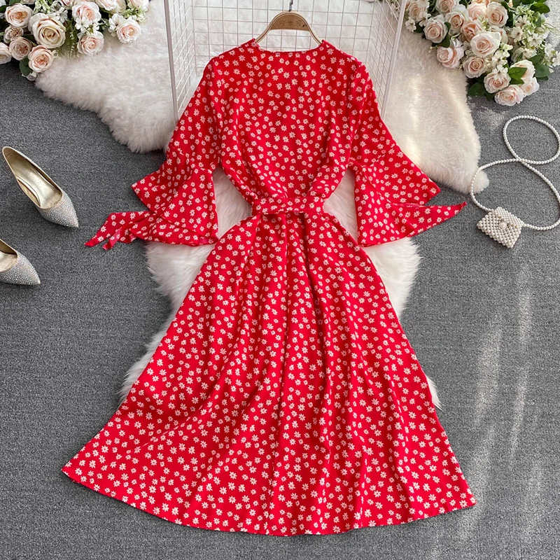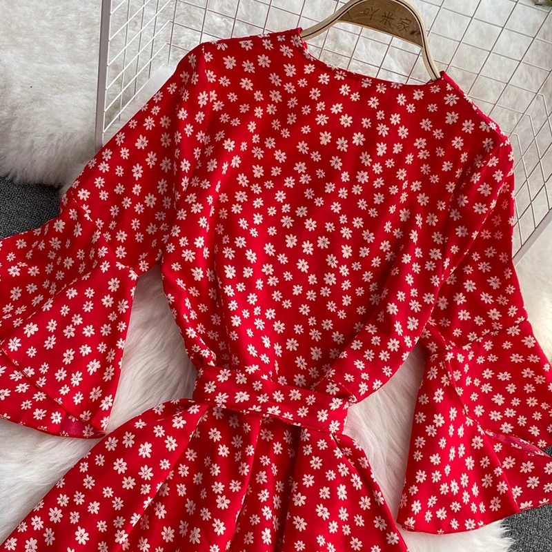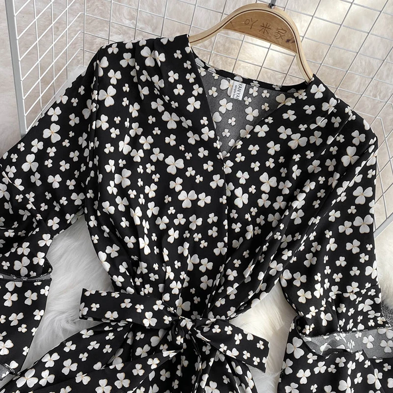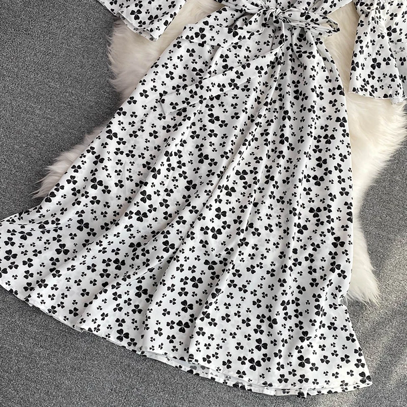 New Stylish Casual V-neck A-line Dress Ladies Sashes Chiffon Spring Autumn Flare Sleeve Midi Dresses for Women Floral Printed