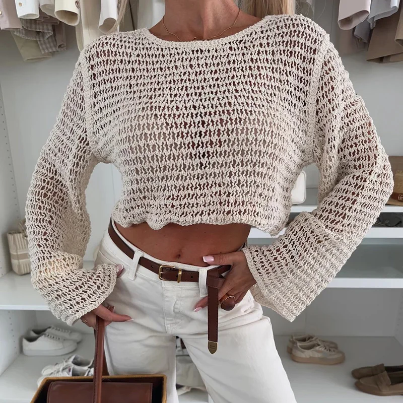 New Summer Beach Holiday Sunscreen Cover Up Blouses Sexy Long Sleeved Solid Pullover Casual O Neck Hollow Out Knitted Slim Tops