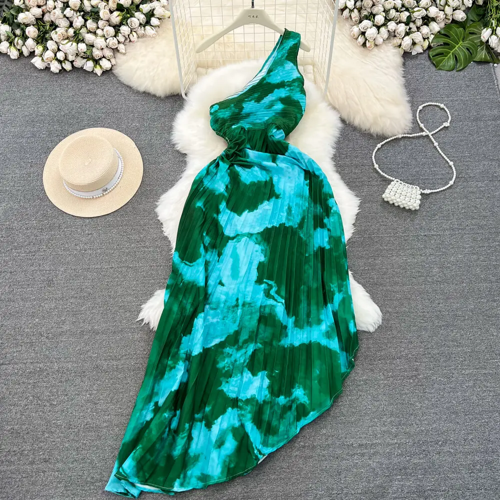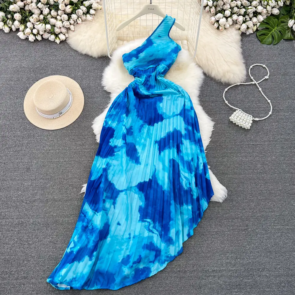 New Summer Sleeveless Pleated Slant Neck Strapless a-line Irregular Printed Dresses