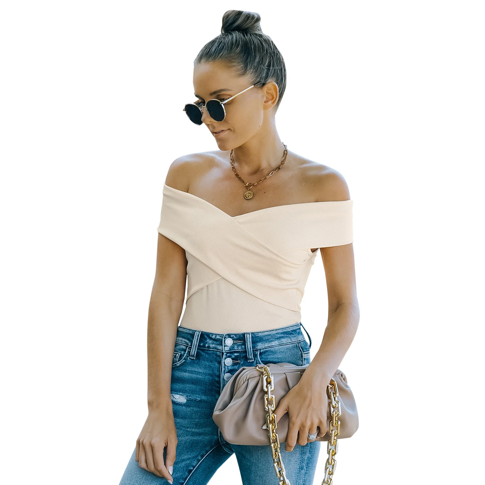 New summer solid color tight body thin strapless off-shoulder women casual tops