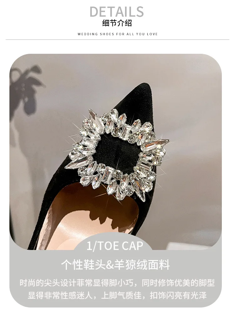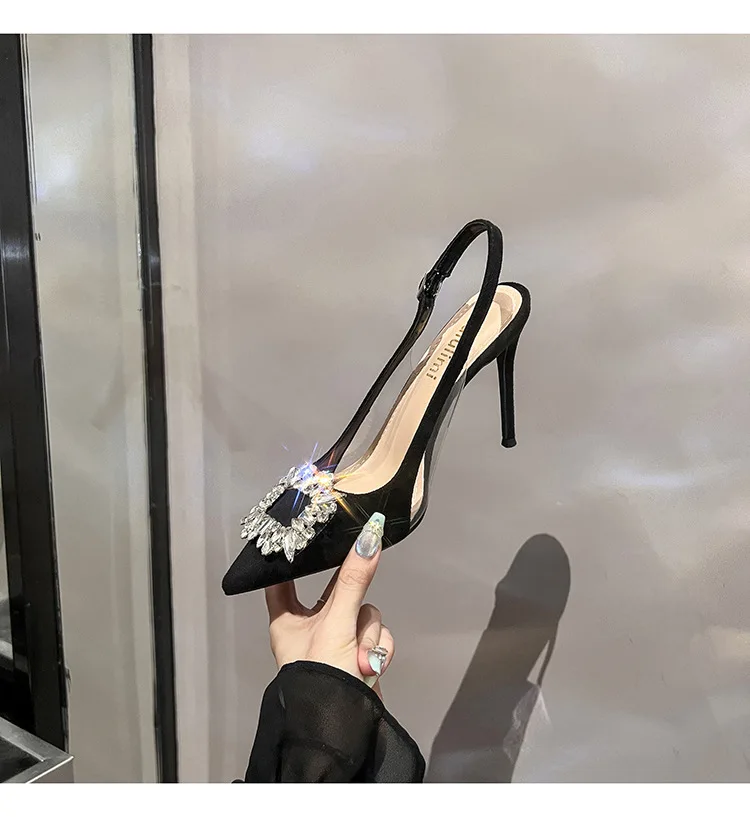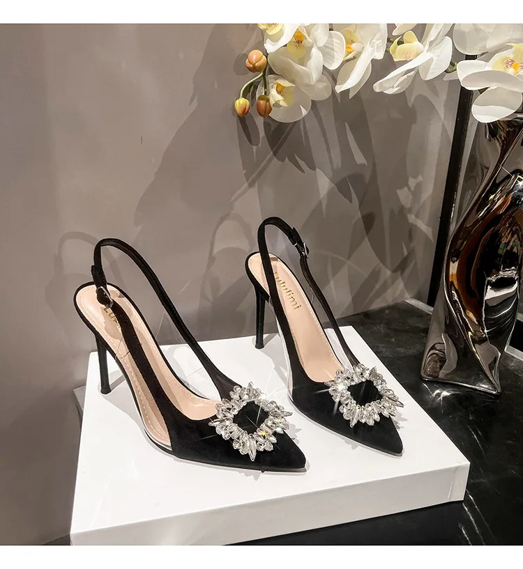 New Summer Women Sandals Thin Heels Suede Square Buckle Rhinestone High Heels Ladies Heels Shoes