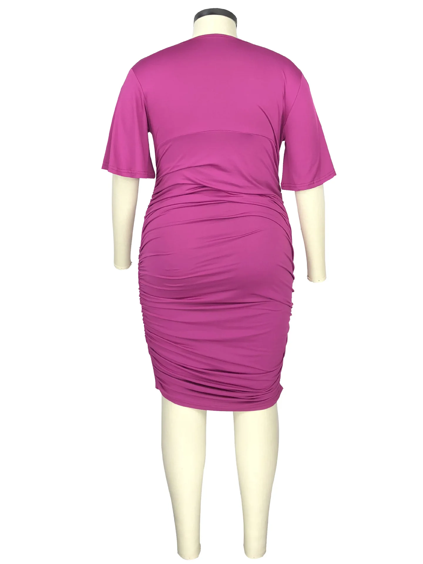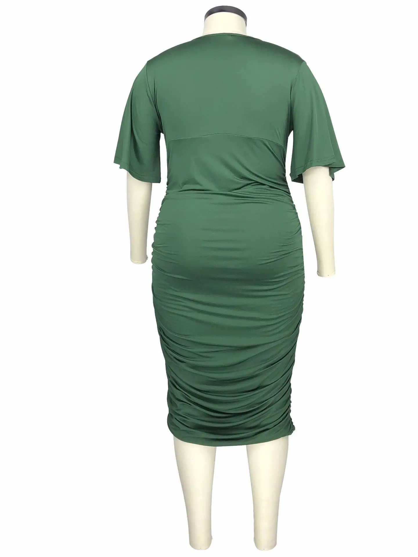 New Trend 3/4 Sleeve Ruffles V Neck Big Plu Size Office Lady Elegant Women Bodycon Midi Dress