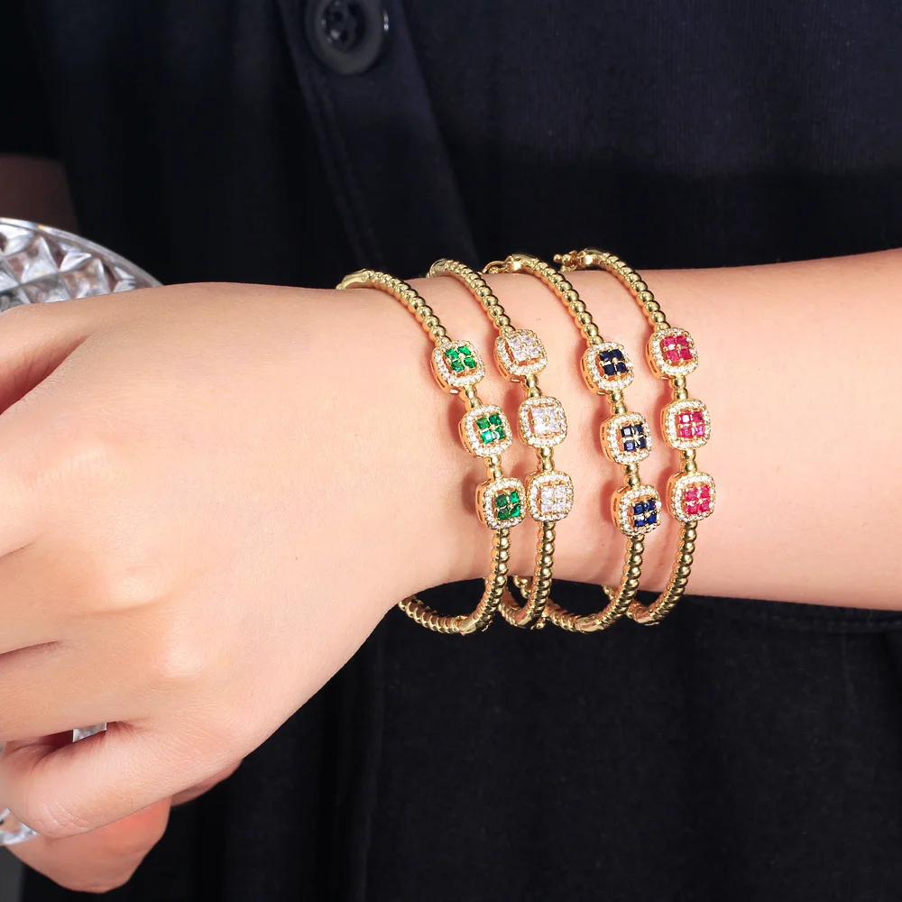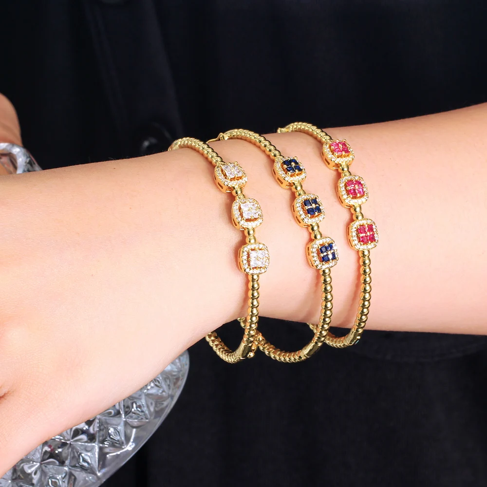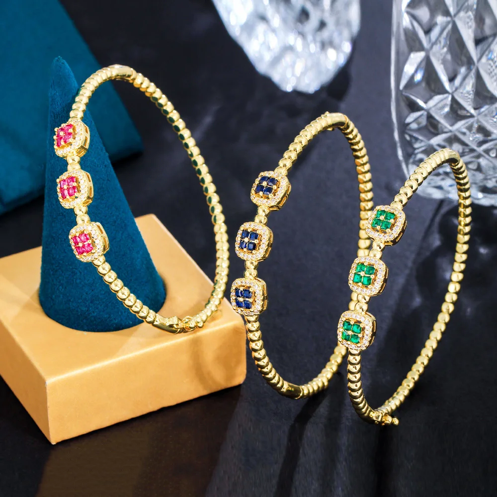 New Trendy Square Green Blue Cubic Zirconia Dubai Gold Plated Safety Clasp Round Bangles for Women Party Gifts