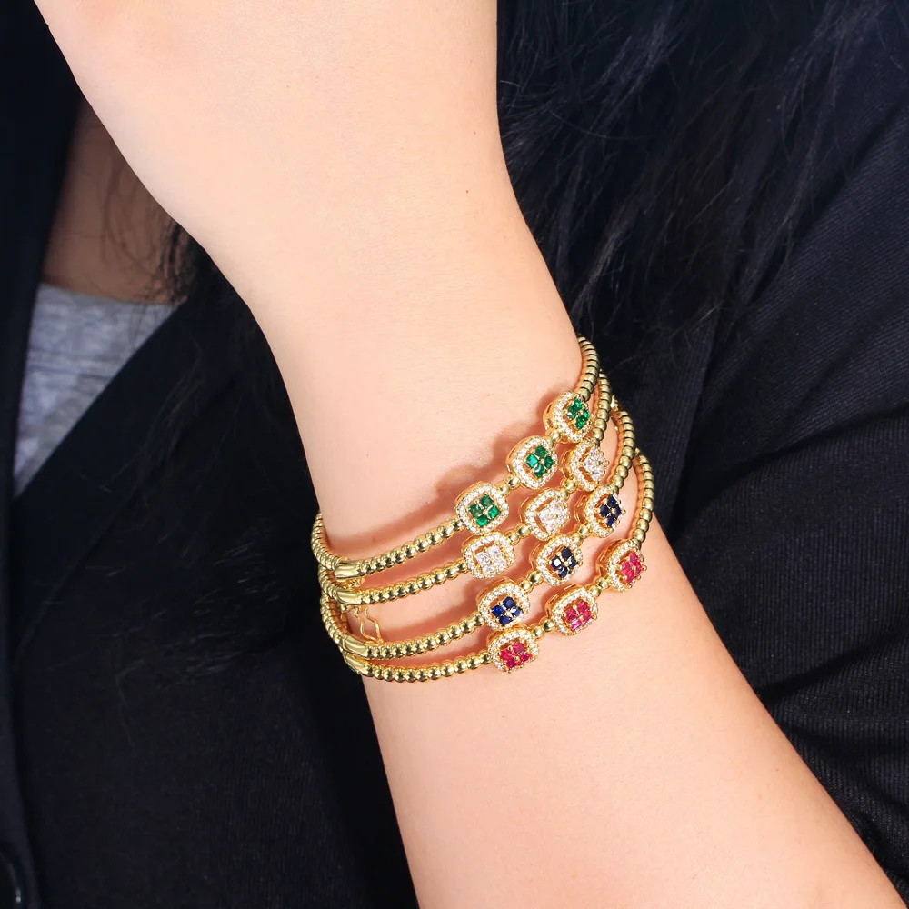 New Trendy Square Green Blue Cubic Zirconia Stone Dubai Gold Plated Safety Clasp Round Bangles for Women Party Gifts