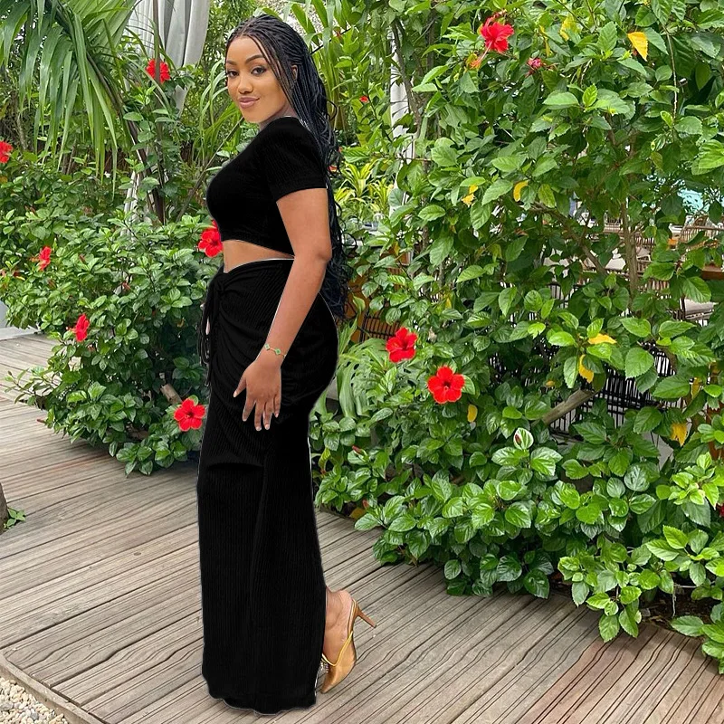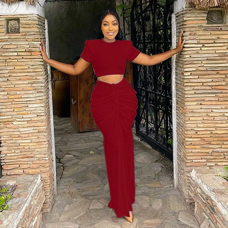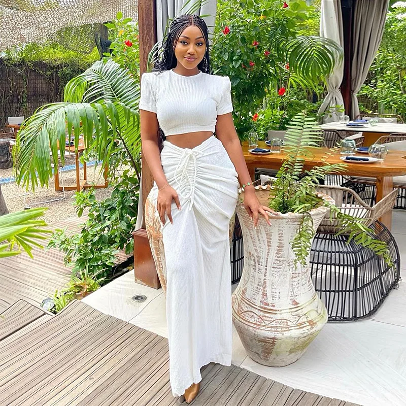 New Two Piece Tight Skirt Set 2024 Simple Women Short Sleeve Pleated Midriff Outfit Party Dress