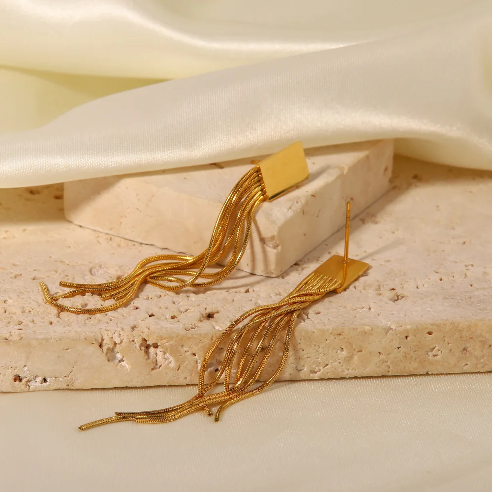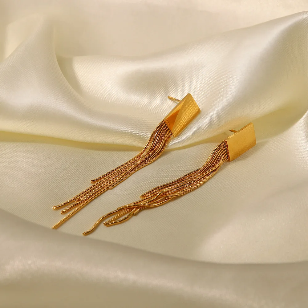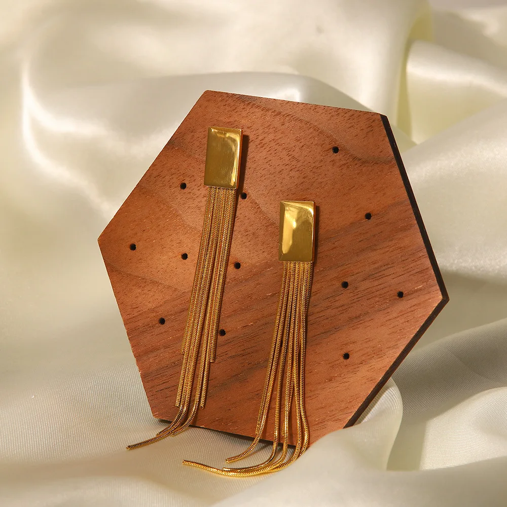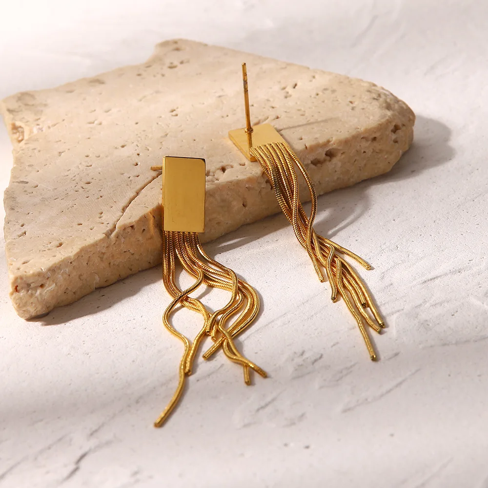 New Waterproof Stainless Steel 18K Gold Plated Jewelry Rectangle Shape Long Tassel Pendant Earrings