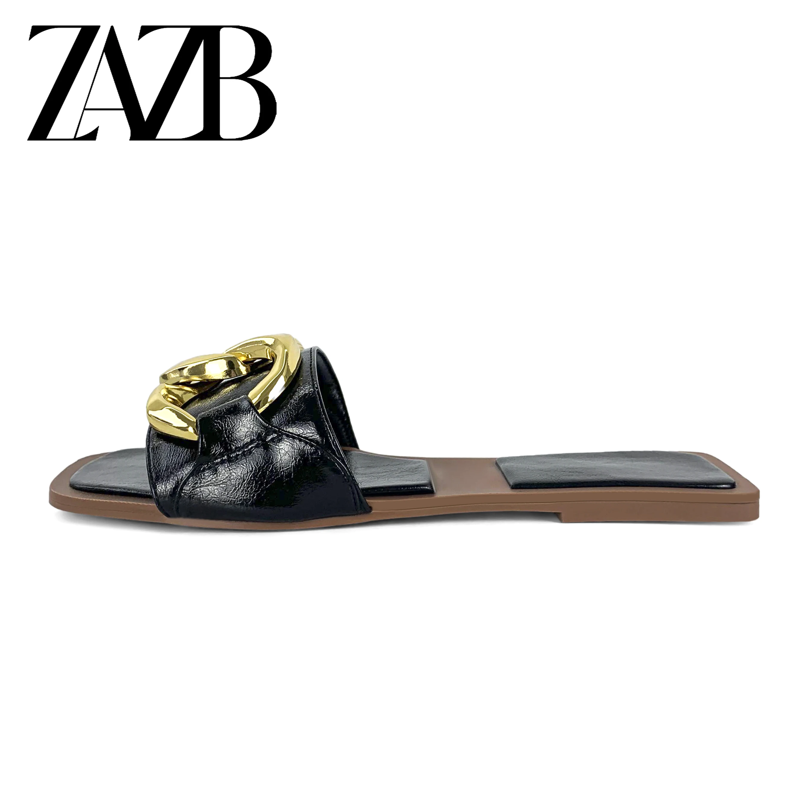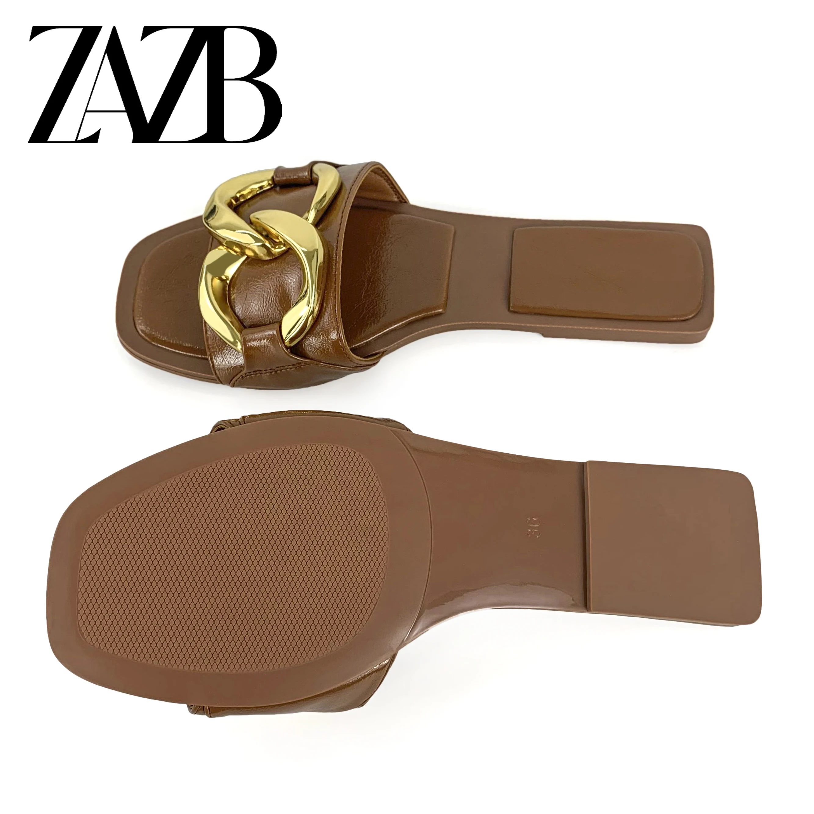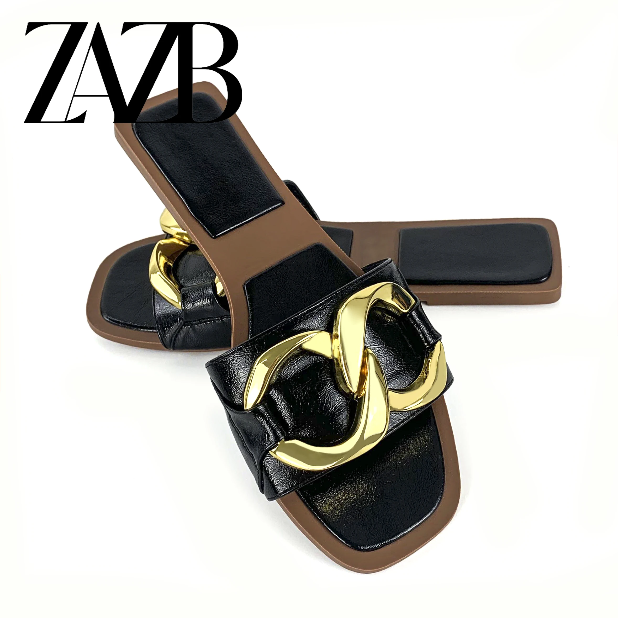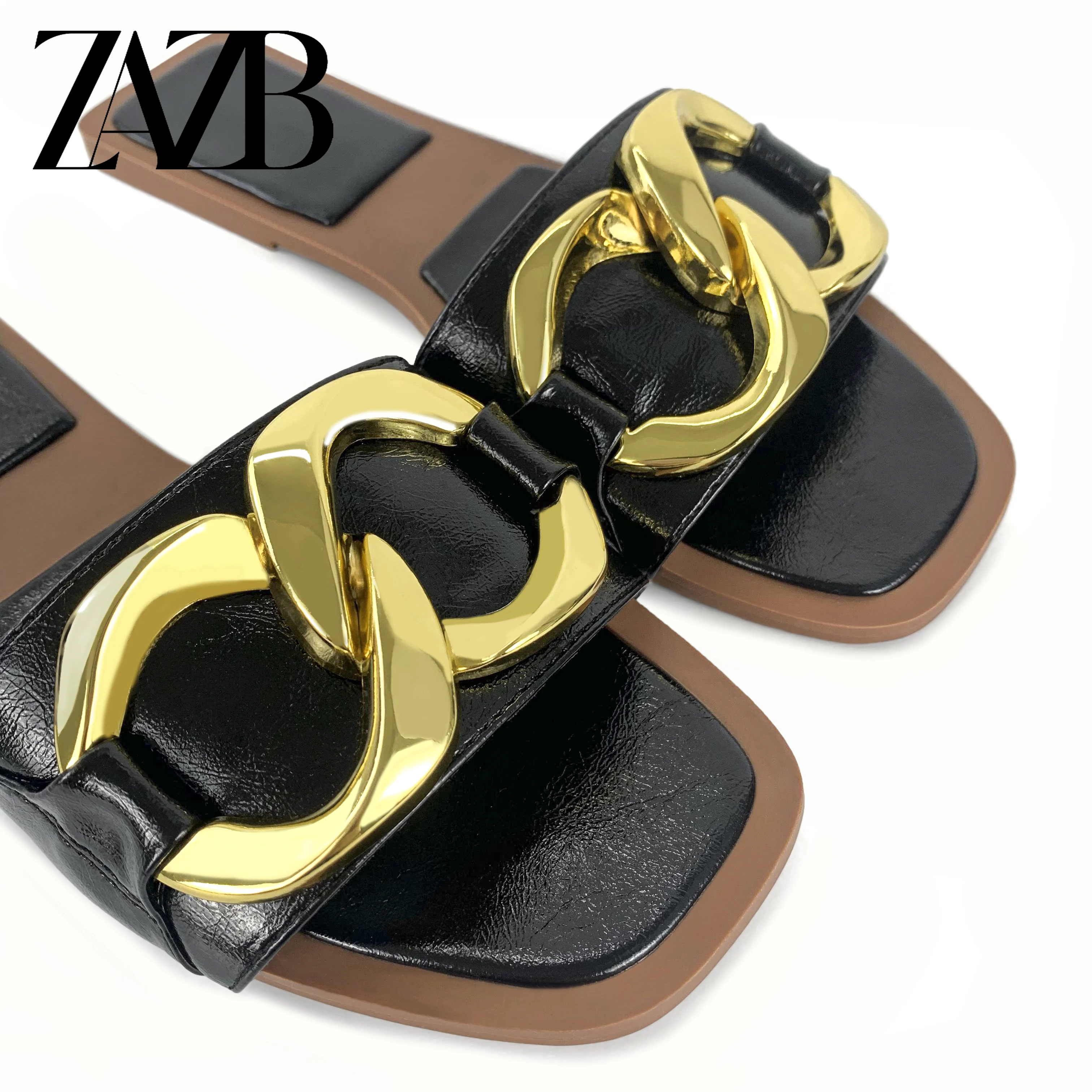 new wholesale design womens shoes summer metal chain beach slippers European and American flat bottomed open toe sandals