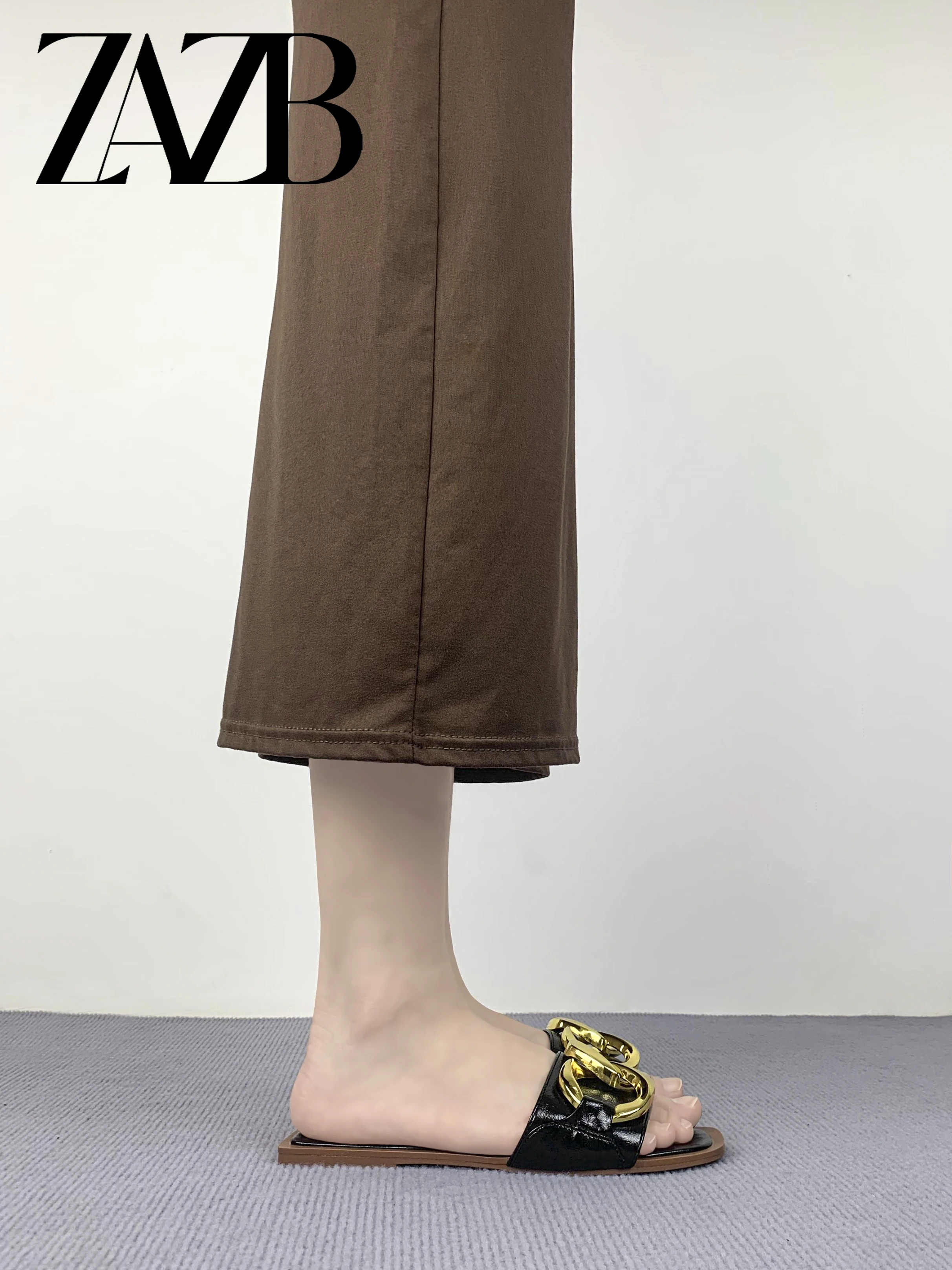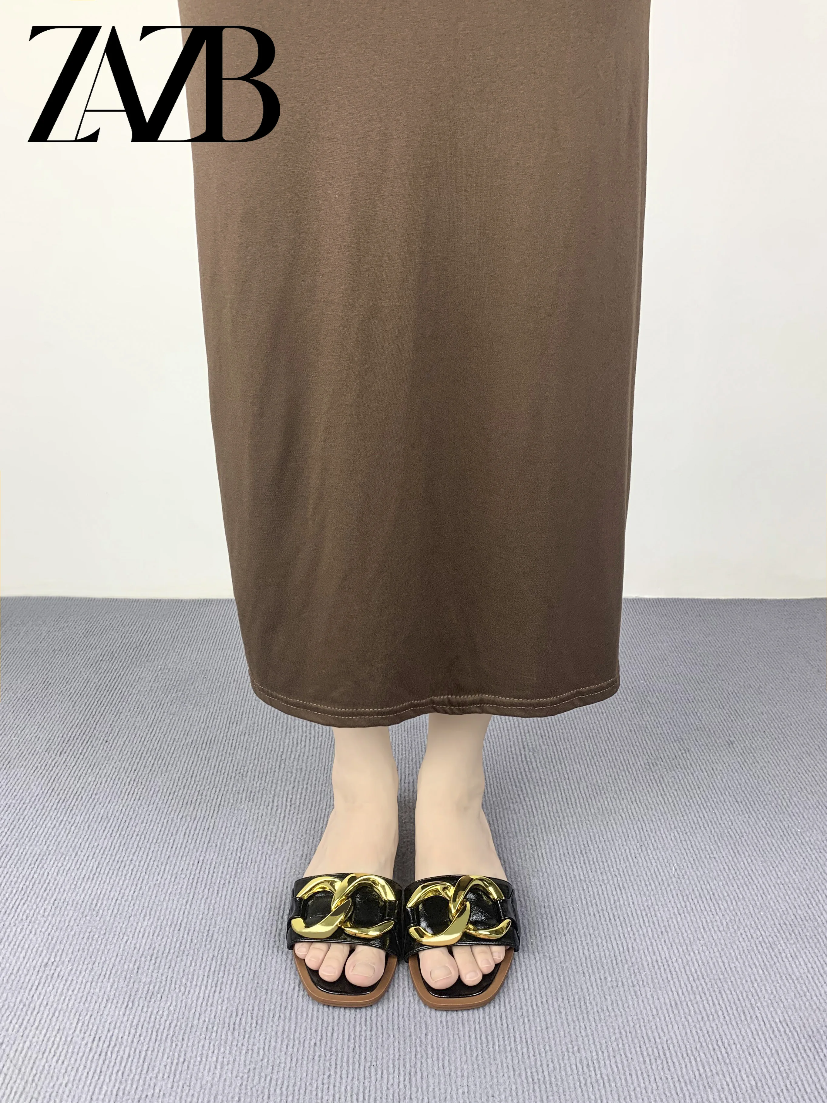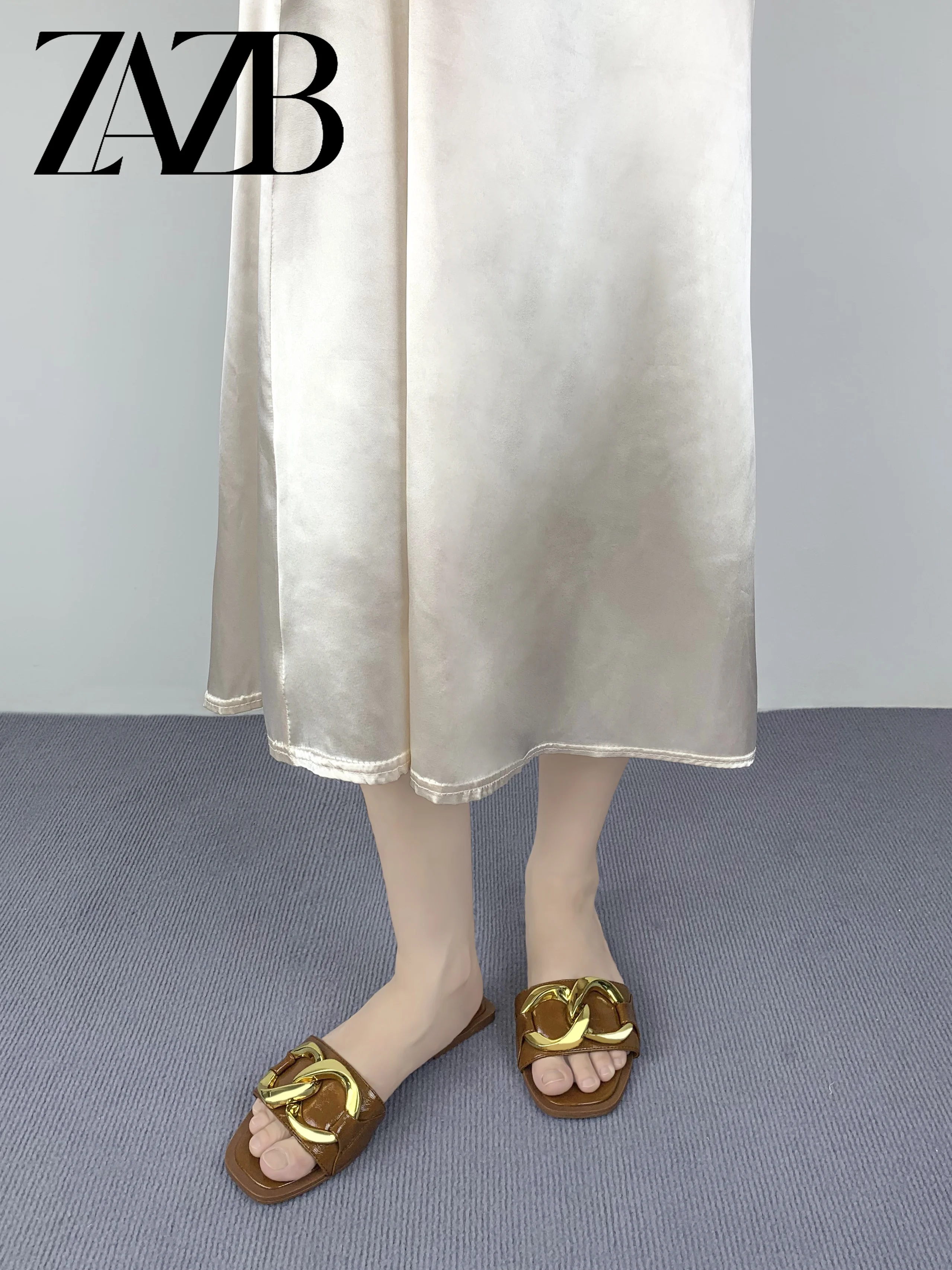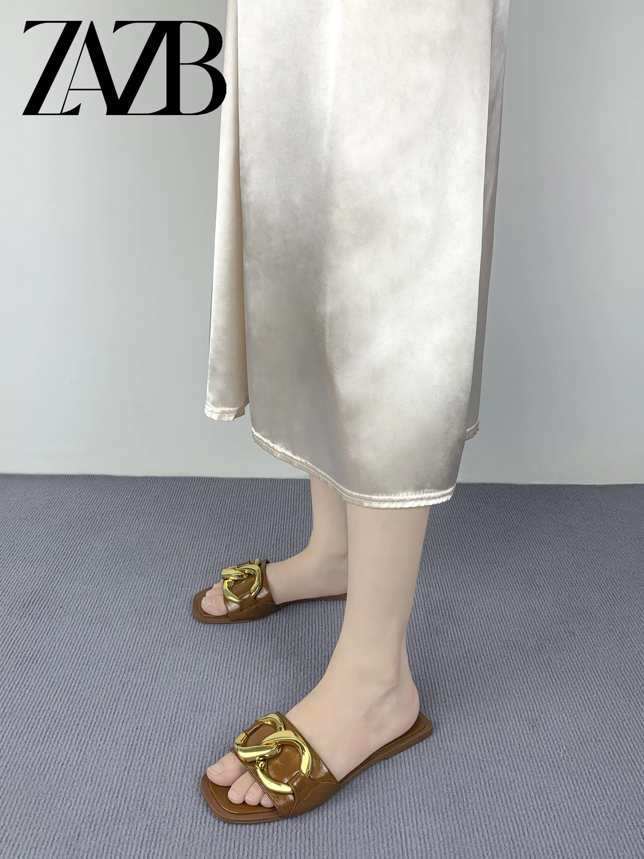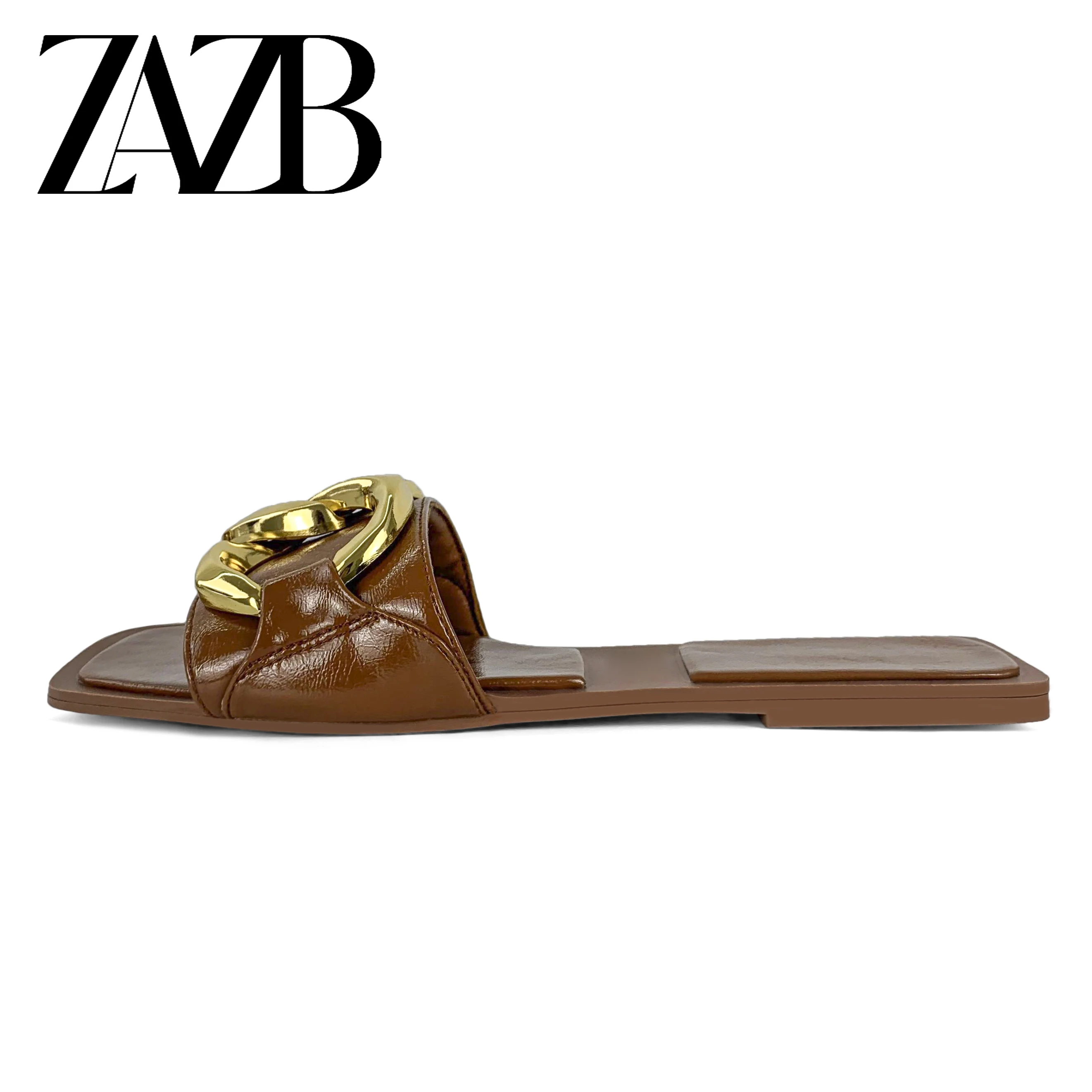 new wholesale design womens shoes summer metal chain beach slippers European and American flat bottomed open toe sandals