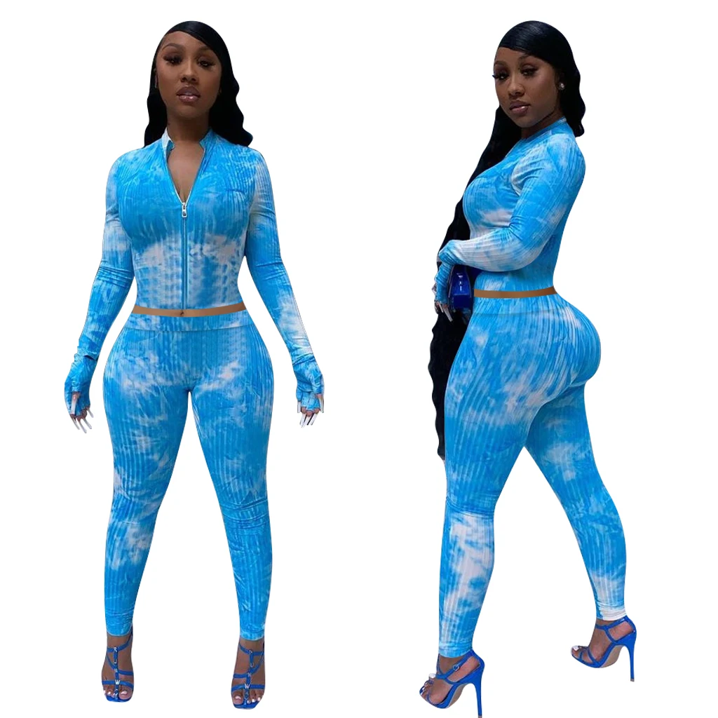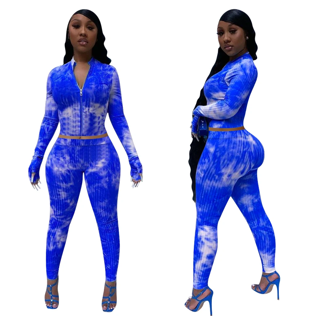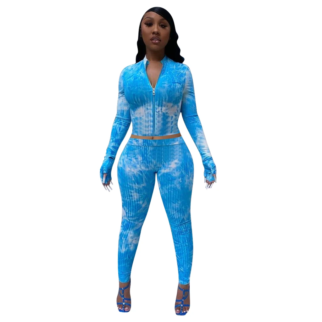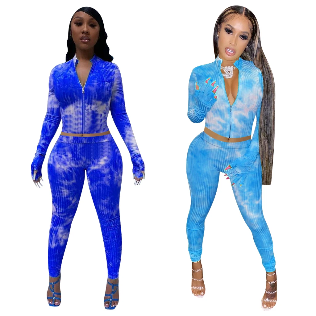 New Women Clothing Ins Style Womens Pit Ribbed Tie-dye Printed Casual Long Sleeve Zipper Bodycon 2 Pieces with Gloves
