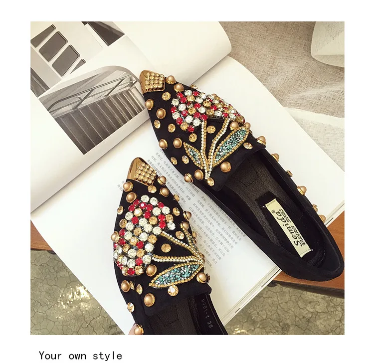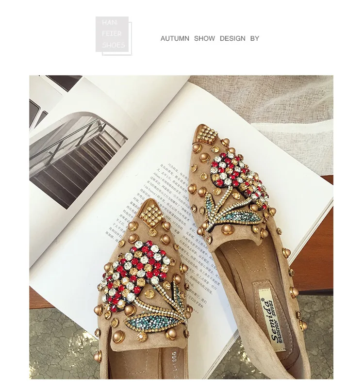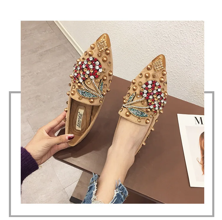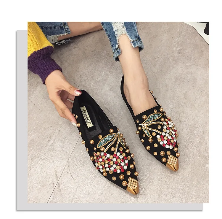 New Women Flat Shoes Rivet Cherry Shoes Rhinestone Ladies Slippers Designs Pointed Celebrity Flat Shoes Ladies Slippers