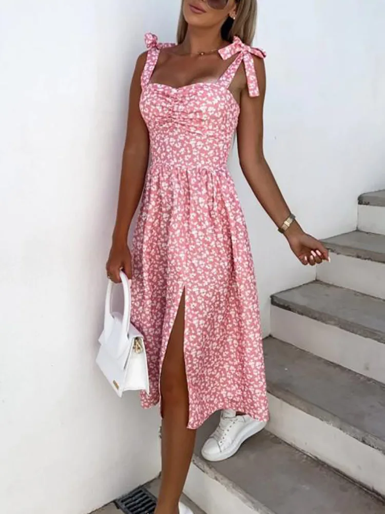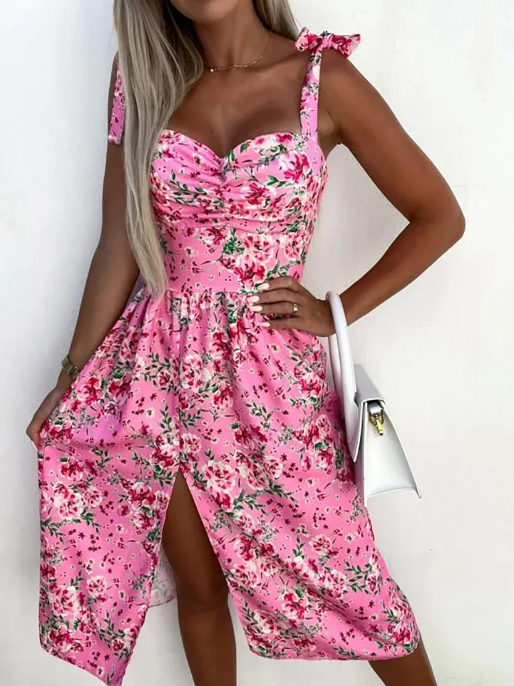 New Women Sweet Backless Split Dress Short Flare Sleeve Beach Style Printing Ladies Dress V-Neck Summer Streetwear Dropshipping