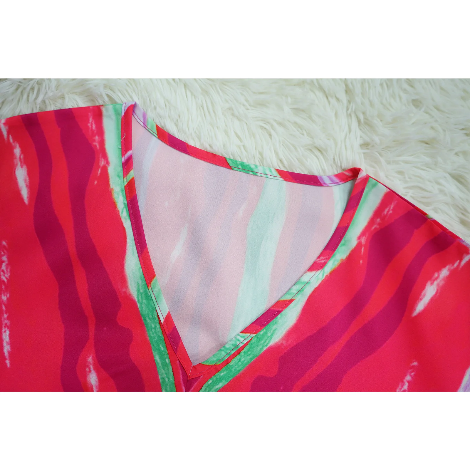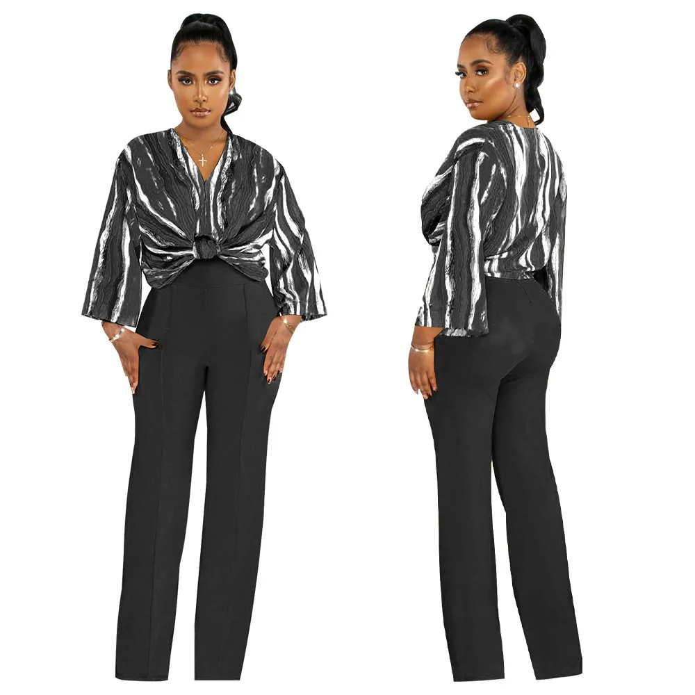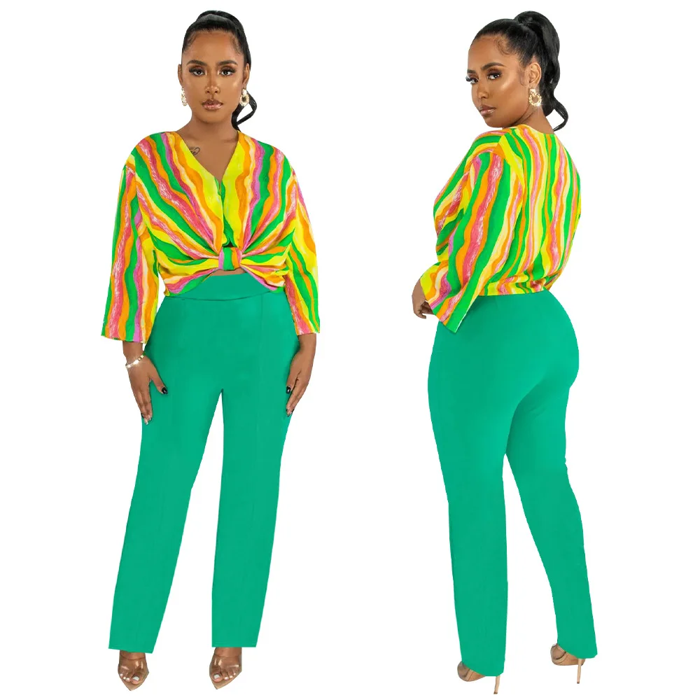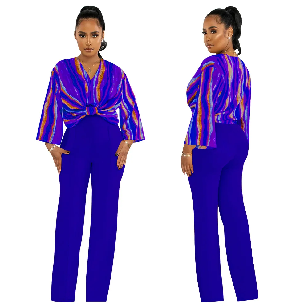New women's suit V-neck printed top solid color straight trouser suit summer
