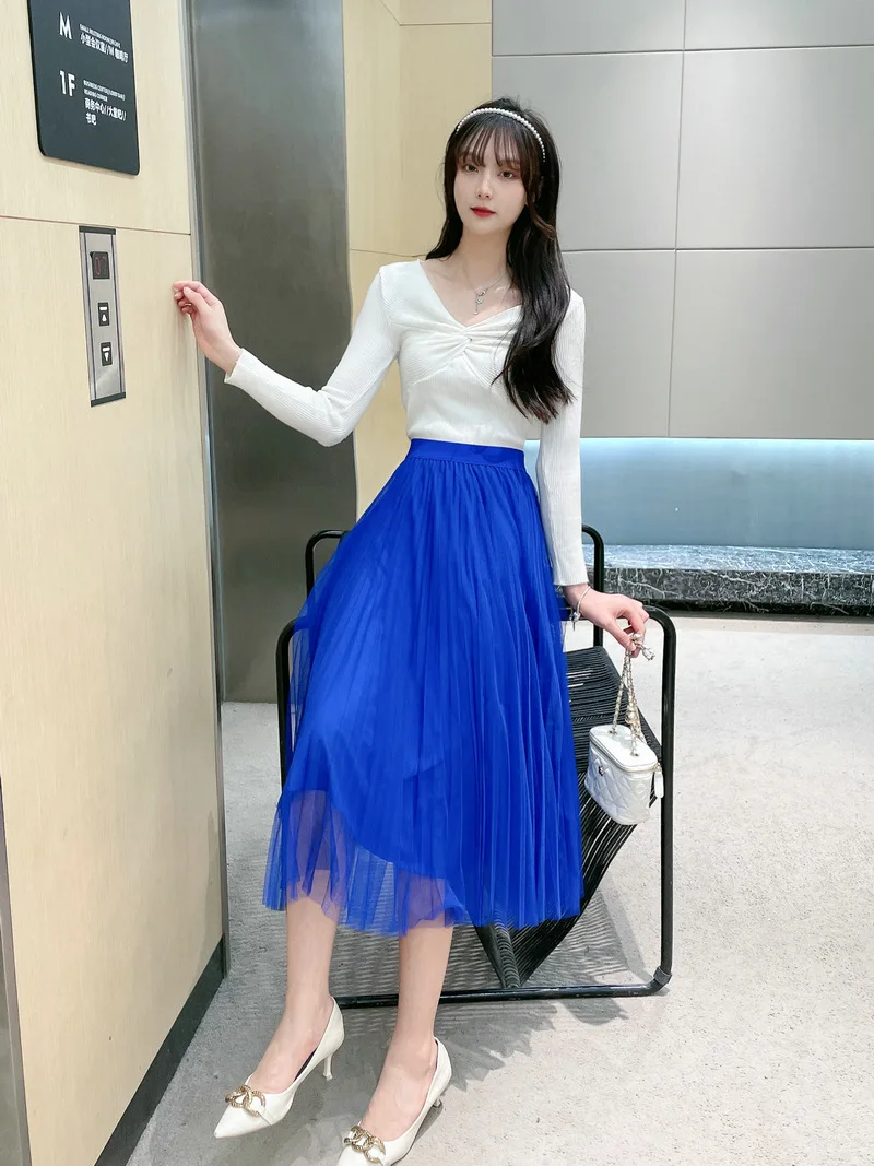 Newest Stylish Luxury Fairy Tulle Skirts for Women Pure Color Elegant Casual Kawaii High Waist Pleated Midi Skirt 10 Colors Jupe